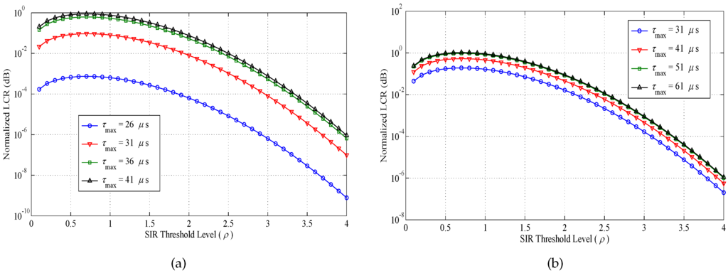 Level crossing rate: (a) observed from AS ( = 32 μs, = 30 m, d = 3 km and = 20 m); (b) observed from GS ( = 25 μs, = 120 m, d = 5 km and = 35 m).