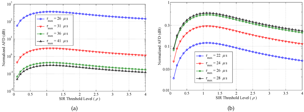 SFs can further be used to study the second order fading statistics, like LCR, AFD, auto-covariance and the coherence distance of the propagation channel. These statistics are defined in terms of angular spread, angular constriction and the direction of maximum fading, as in [28,35]. Azimuthal SFs are used in the analysis of the second order fading statistics. The LCR, , quantifies how often a threshold is crossed by a fading and is defined as,
