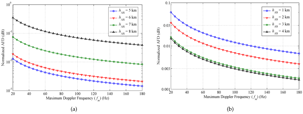 A detailed analysis on the second order statistics of the A2G channel is presented. The impact of major parameters, such as the height of AS, the longest propagation path’s delay and maximum Doppler frequency on these fading statistics, is analysed. The plots of the normalised LCR against the threshold level observed from AS and GS for different heights of AS are shown in Figure 11a,b, respectively. The LCR observed from AS increases gradually with the increase in the threshold level up to a certain level, and then, it decreases with the further increase in the threshold level. However, LCR decreases by increasing the height of AS, because LCR is sensitive to the density of scatterers, and AS is assumed as a scattering-free region. The LCR observed from GS is showing the same behaviour with respect to the threshold level as observed from AS, but it shows a converse trend with respect to the height of AS. The plots of the normalised LCR against the threshold level observed from AS and GS for different values of are shown in Figure 12a,b, respectively. The LCR observed from AS increases gradually with the increase in the threshold level up to a certain level, and then, it decreases with the further increase in the threshold level. However, LCR decreases by reducing , and the rate of decrease is changed rapidly by reducing the , because AS moves away from GS. The LCR observed from GS is showing the same behaviour with respect to the threshold level, as well as with respect to . However, when the projection of AS on the x-y plane lies inside the TESR, LCR increases up to a level because of the density of scatterers and then almost remains constant for the further increase in . The plots of the normalised AFD against the threshold level observed from AS and GS for different values of are shown in Figure 13a,b, respectively. When observed from AS, AFD increases gradually with the increase in the threshold level up to a certain level, and then, it slightly decreases with the further increase in the threshold level. However, AFD increases by reducing , and the rate of increase is changed rapidly by reducing the because AS moves away from GS. The AFD, when observed from GS, is showing the same behaviour with respect to the threshold level when observed from AS. However, when the projection of AS on the x-y plane lies inside the TESR, AFD increases with the increase in up to a level because of the density of scatterers and then almost remains the same for the further increase in . The the plots of the normalised AFD against different values of the maximum Doppler frequency observed from AS and GS showing the effects of the height of AS are shown in Figure 14a,b, respectively. When observed from AS, AFD decreases smoothly with the increase in Doppler frequency. However, AFD increases by increasing the height of AS, and the rate of increase is higher with respect to the increase in the height of AS. Therefore, by increasing the height of AS, the projection of AS on the x-y plane moves out of the scattering region for a given delay; therefore, the number of multipaths is reduced, which results in the increase of AFD. The AFD, when observed from GS, is showing the same behaviour with respect to Doppler frequency, as observed from AS, but it shows the converse trend with respect to the height of AS.
