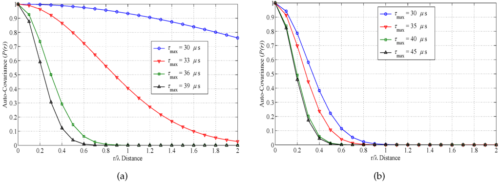Auto-covariance is another important statistic, which determines the correlation of the received voltage envelope as a function of the change in the receiver position and is useful for studies in spatial diversity [28,42]. An expression of auto-covariance based on SFs is given in [43], which can be approximated as below,