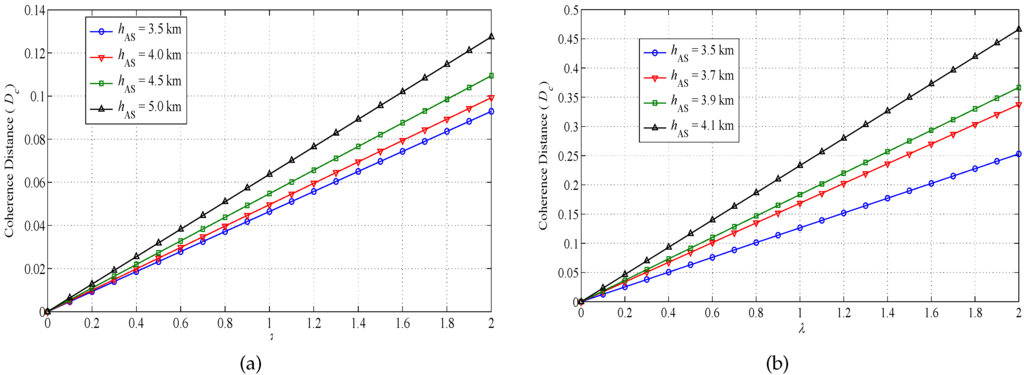 Coherence distance: (a) observed from AS ( = 32 μs, = 30 m, d = 3 km and = 20 m); (b) observed from GS ( = 25 μs, = 120 m, d = 5 km and = 35 m).