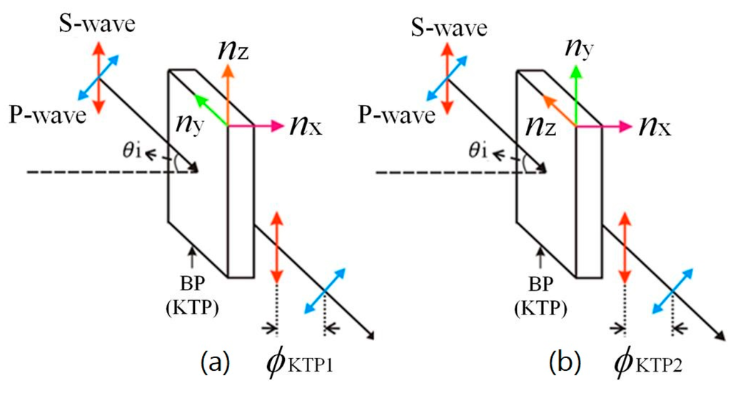 where λ is a wavelength of the incident light, t is a thickness of the BP, ni is a RI of the immersed medium and θi is an incident angle. The refractive indices of extraordinary and ordinary are represented by ne and no (ne = 2.203 and no = 2.286 at 632.8 nm) in the MgO:LN []. Three different refractive indices, nx, ny, and nz (where nx = 1.7619, ny = 1.7712 and nz = 1.8648 at 632.8 nm), are used for the KPT []. LN1 and LN2 are the phase variations of the s-wave applied parallel and perpendicular to the ne-axis of MgO:LN, respectively. KTP1 and KTP2 are the phase variations for the s-wave applied parallel and perpendicular to the nz-axis of KTP, respectively.