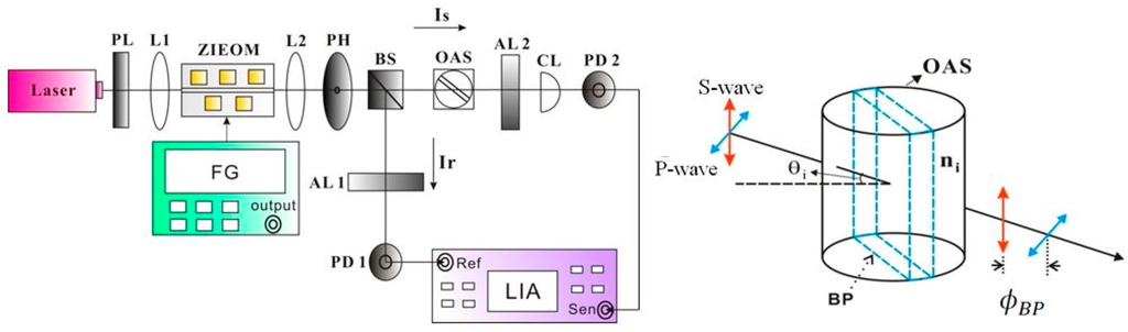 The proposed common-path interferometer for optical angle measurement is shown in Figure 3. A He-Ne laser with a 632.8 nm wavelength is launched through a polarizer (PL) at 45°. The input light is coupled into a lithium niobate Zn-Indiffused electro-optic modulator (ZIEOM) [] through an objective lens (L1). The homemade ZIEOM is a waveguide-type electro-optic device that was fabricated in an x-cut/z-propagation lithium niobate substrate. The detailed fabrication process and the applications of heterodyne and homodyne interferometry have been reported in our previous work [,]. In the heterodyne interferometry, the frequency shifted between two orthogonal lights in the ZIEOM can be generated by applying a prompt sawtooth voltage driven from a function generator (FG). The driving voltage and frequency are 7 V and 100 kHz, respectively. The light is then focused by another lens (L2). A pinhole (PH) is used to block the scattering light. The incident light is divided into two different paths after passing through a beam splitter (BS). The transmitted and reflected paths are used as sensing (Is) and reference (Ir) lights, respectively. The OAS was made using a 1 mm thick BP placed in a cylindrical glass cell filled with different liquids, as shown schematically in the inset of Figure 3.
