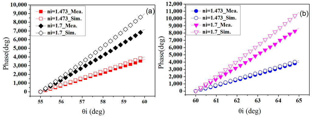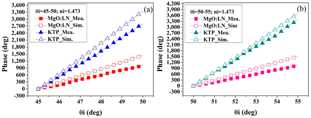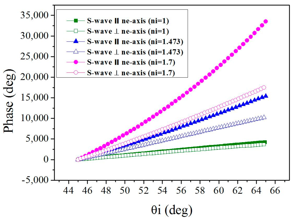 Figure 5 shows the simulation results of phase change versus incident angle for the two crystal orientations and the different RIs of mediums with incident angles ranging from 45° to 65°, according to Equations (1) and (2). The solid and empty symbols of the simulated curves represent the s-wave parallel and perpendicular to the ne-axis, respectively.