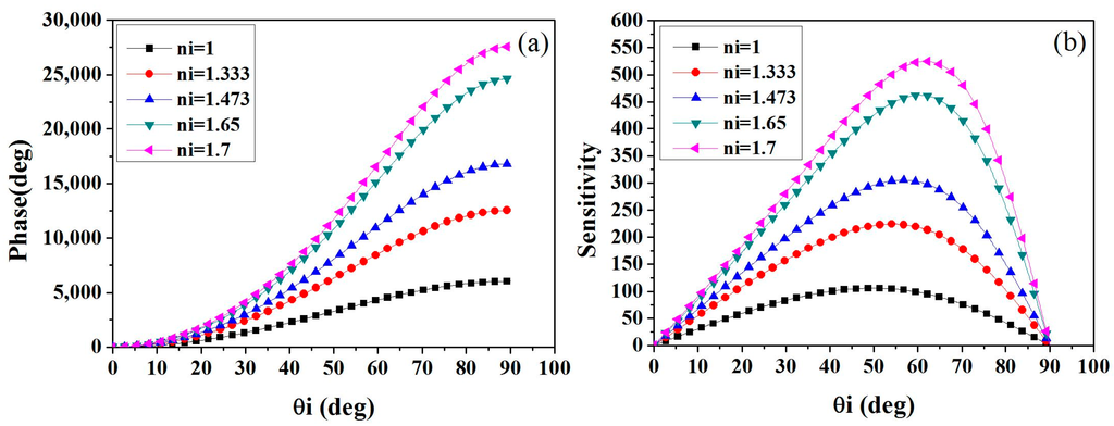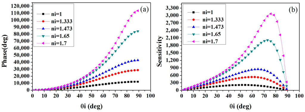 Simulations for KTP-OAS: (a) phase change vs. incident angle; and (b) sensitivity vs. angle for different refractive indices of environment.