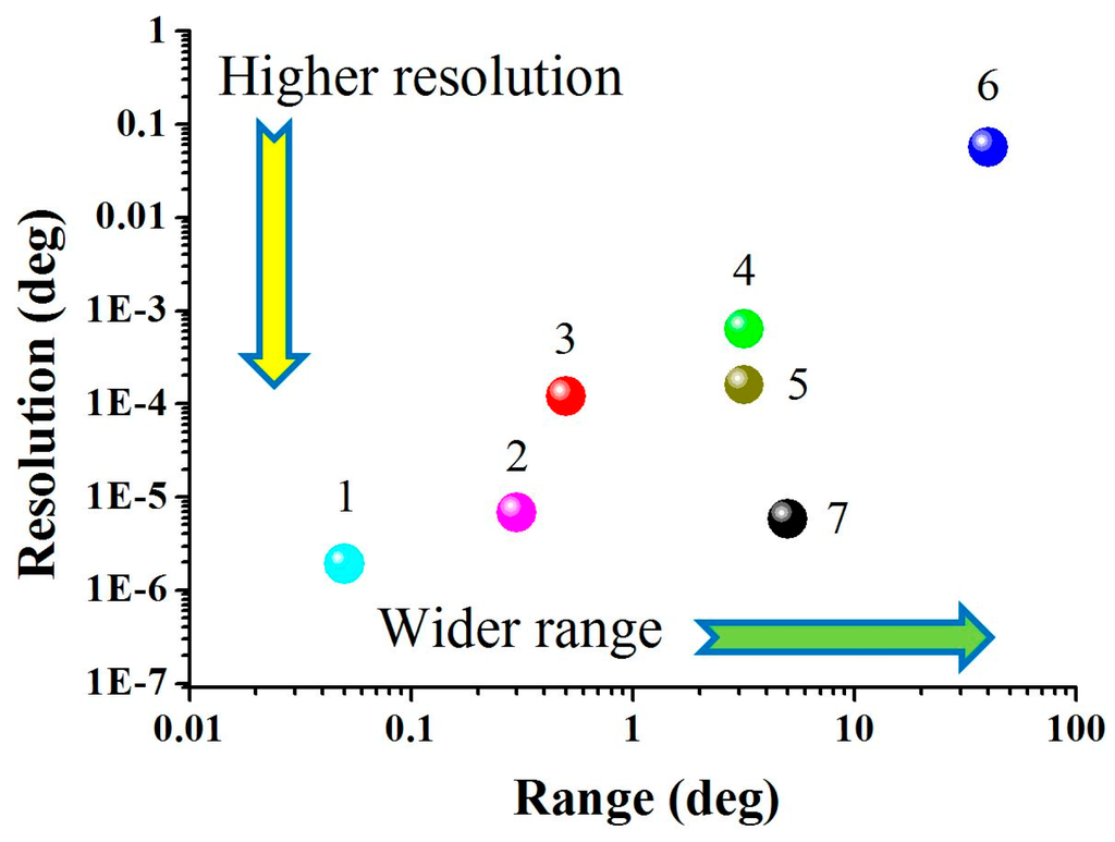 Comparisons of resolution and linear range between the proposed birefringent-refraction transducer (#7) and other published results, including #1 (Ref. []), #2 (Ref. []), #3 (Ref. []), #4 (Ref. []), #5 (Ref. []), and #6 (Ref. []).