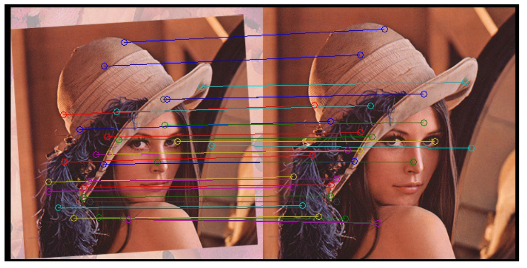Specifically, the SURF algorithm [,] is a novel scale and rotation-invariant detector and descriptor. SURF approximates or even outperforms a previously proposed SIFT algorithm [,], which is patented, with respect to repeatability, distinctiveness, and robustness, yet can be computed and compared much faster. Thus, the method posited here improves feature extraction speed. SURF extracts the feature vectors of the provided image as follows. First, SURF selects several interest points at distinctive locations in the image, such as corners, blobs, and T-junctions. Such points are selected in such a way that enables the detector to find the same physical interest points under different viewing conditions. Next, the neighborhood of every interest point is represented by a feature vector. This descriptor has to be distinctive and robust to noise, detection displacements, and geometric and photometric deformations. The descriptor vectors are matched between different images. Matching is based on a distance between the vectors, e.g., the Euclidean distance or cosine similarity. Figure 1 illustrates the interest points of Lena image and their counterparts in the same image after rotation.