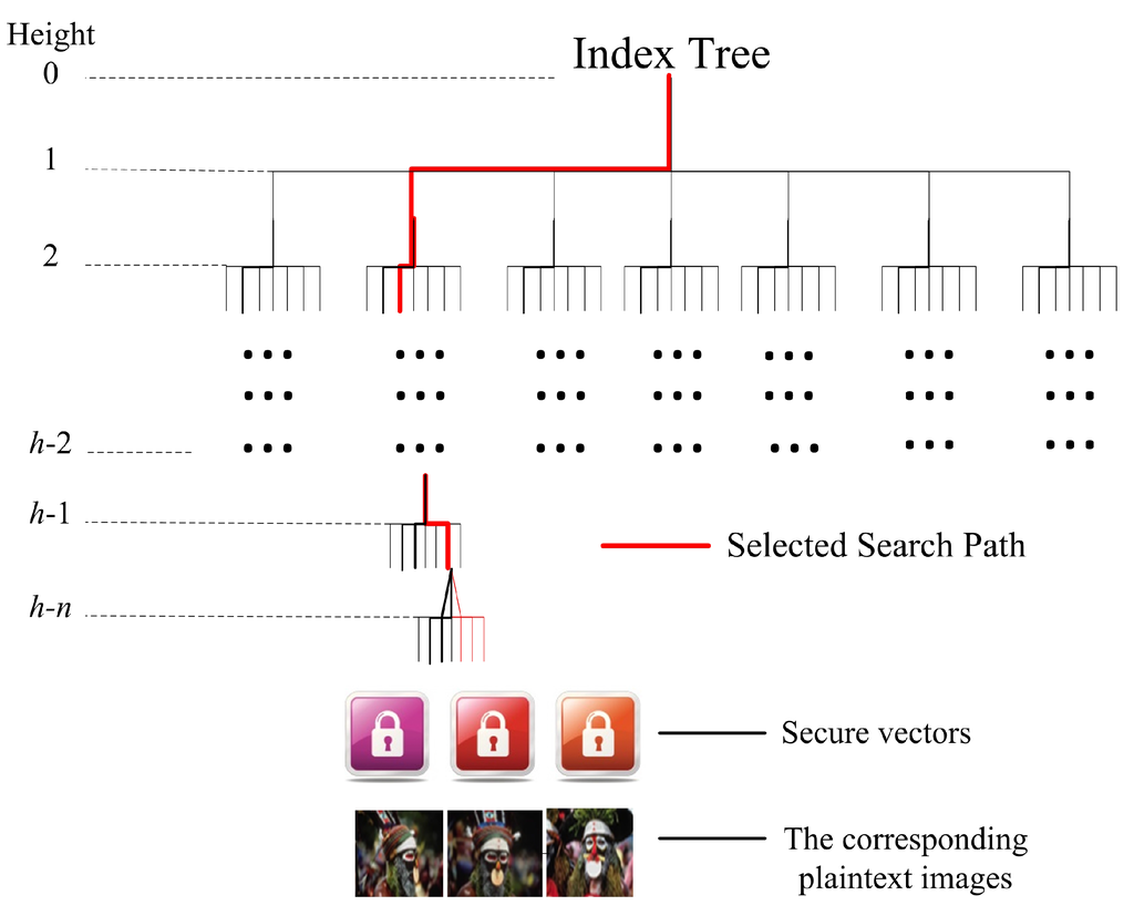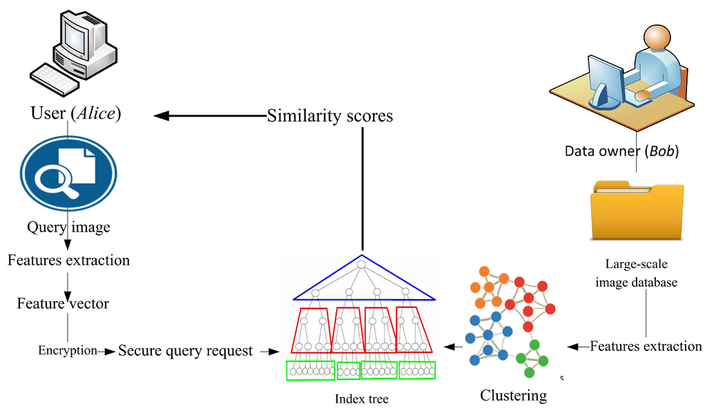 In this paper, we address the question of how to search for similar images between two parties in a privacy-preserving manner without losing image confidentiality. Given image I, Alice would like to determine whether there are images in Bob’s collection D that are similar to I (e.g., duplicate, near duplicate, somewhat close, etc.) without disclosing either I or D. We focus primarily on security, where protecting the descriptors of images is necessary. Specifically, our proposed scheme supports speeded up robust features (SURF) local-feature [,] with cosine similarity [], as well-known metric to score matching images, and employs homomorphic encryption [] to protect the confidentiality of descriptors. To increase the effectiveness of the image search, we build a tree-based index structure by employing the k-means clustering algorithm to classify large-scale images database into various clusters. The method allows only the inquiring side to see the matching value. Hence, only Alice is interested in determining whether she has any image in common with Bob, without worrying about the leakage of unnecessary information.