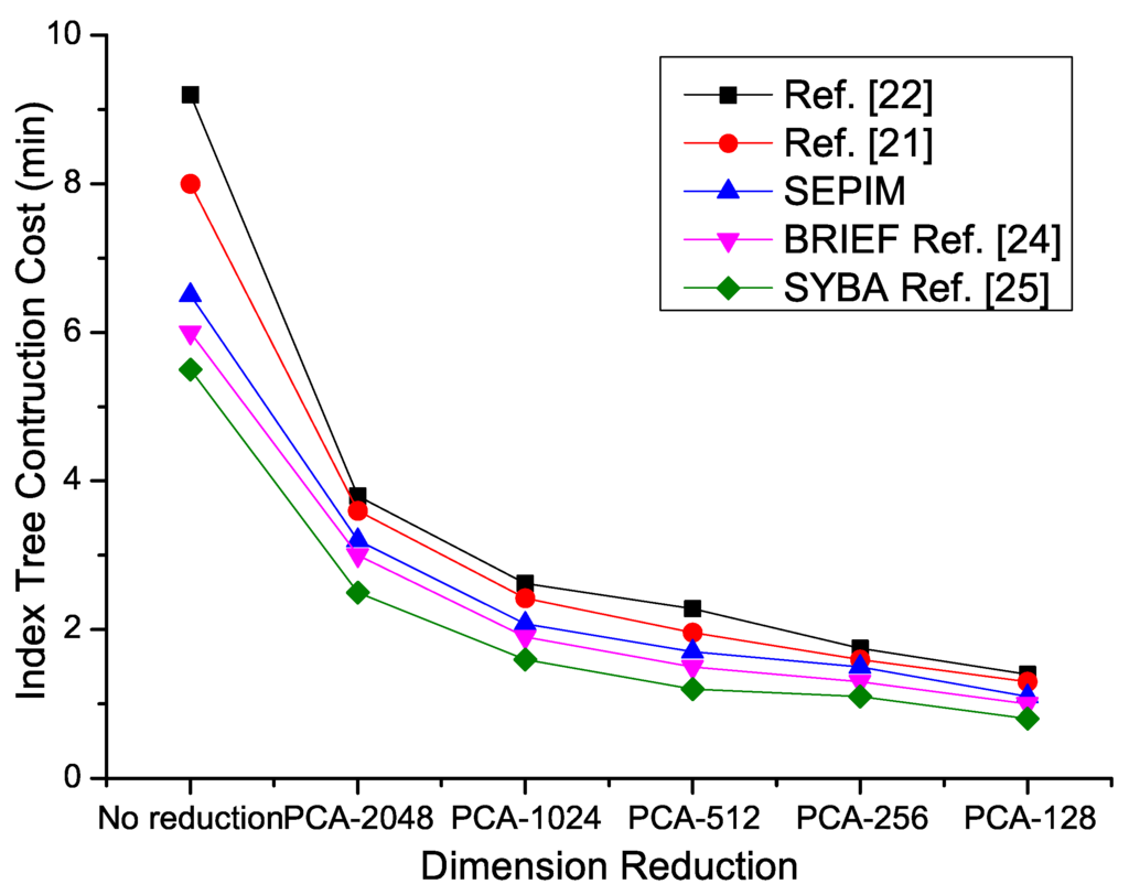 Index tree building cost for 10,000 images of variable dimension reductions. PCA: principal component analysis; BRIEF: binary robust independent elementary features; SYBA: SYnthetic BAsis.