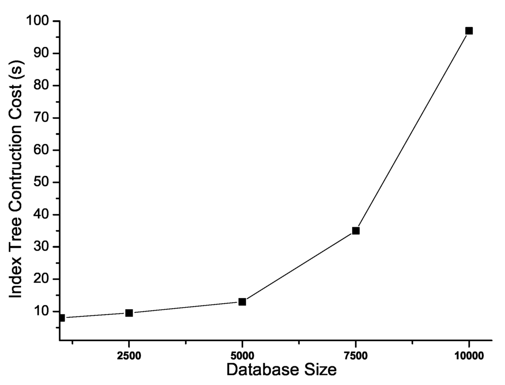 To setup the system, the data owner first employs a SURF algorithm in order to extract a descriptor vector for search, each of which, in turn, requires the computation of a -dimensional. Then, the data owner encrypts all descriptor vectors used for the search process, and each requires the computation of -dimensional secure dot products. Following this step, the data owner proceeds to construct the index tree TreeIndex with k-means operations. We evaluate the building cost of TreeIndex within the framework of lowering the dimension using the PCA method and the dataset size. Figure 4 shows that lowering dimension can lower the building cost of TreeIndex, since a majority of functions in the k-means algorithm are distance computation, and, therefore, with linear cost to the vector’s dimension. Regarding the size of the data set, it is clear that the expansion of dataset size will necessitate a higher computational cost for building a TreeIndex, (see Figure 5) because the owner requires undertaking more k-means clustering on an increased amount of vectors.