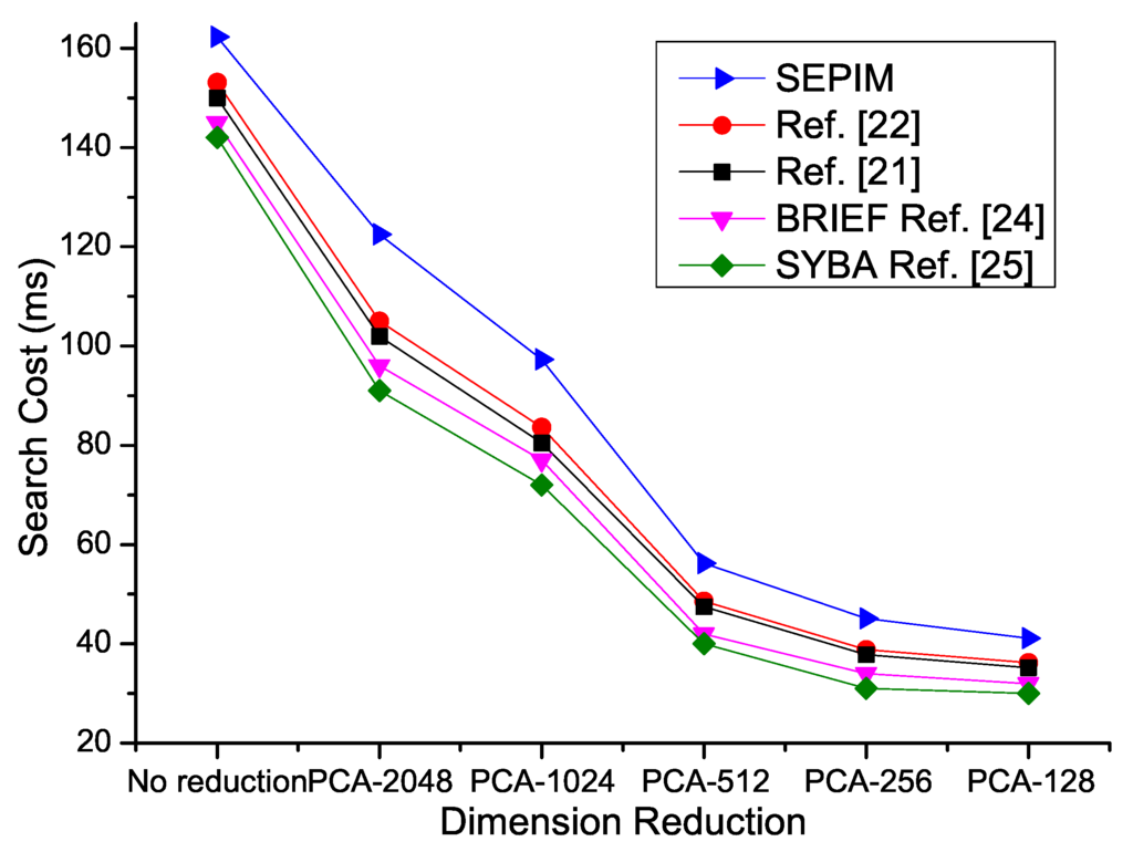 Figure 8 evaluates the level of search precision to which SEPIM conforms under variable dimension reductions. This formula employs MAP, which was introduced in Section 3.2, and demonstrates SEPIM acquiring a similar precision in search as plaintext image search schemes [,,,], with just 2% lower precision. SURF shows better performances as compared with SYBA and BRIEF approaches. Such approaches did not perform well when there is a large viewpoint change, and their lack of invariance to rotation is prominent. Because BRIEF and SYBA, unlike SURF, does not correct for orientation.