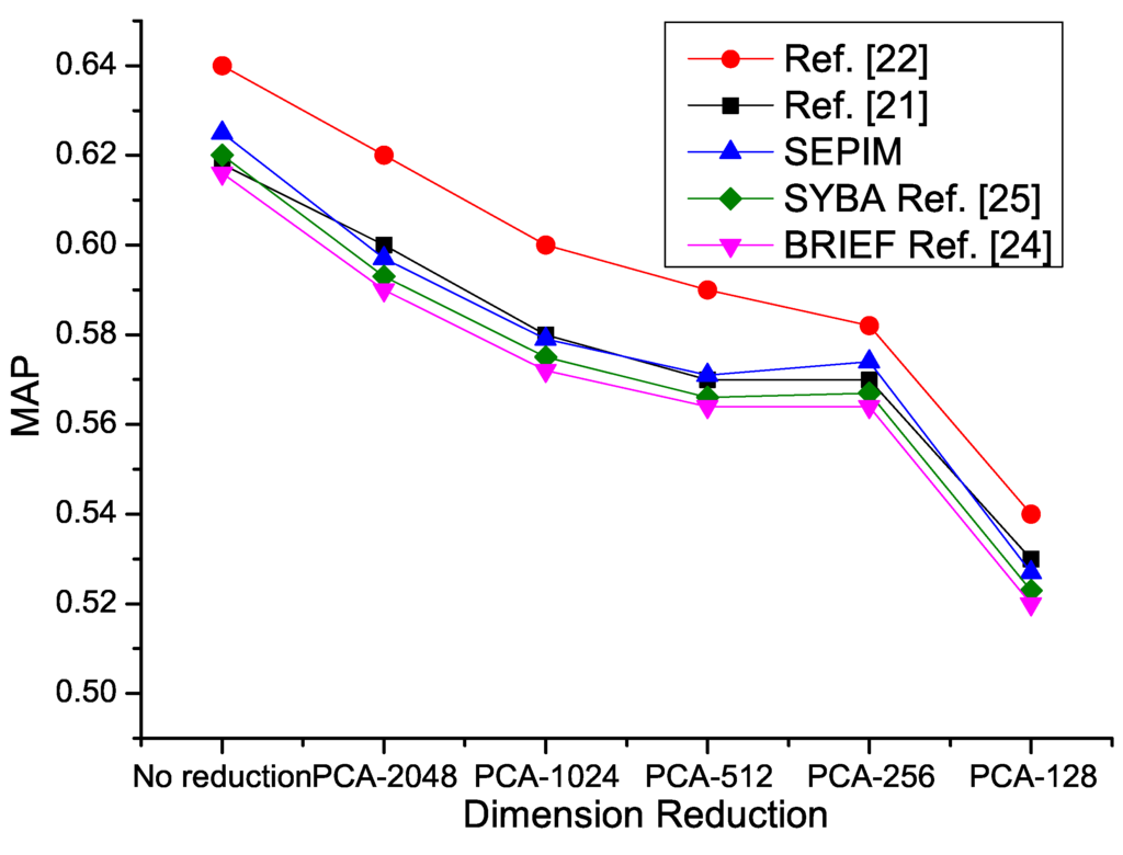 The figure renders clear the negative relation between the MAP of SEPIM and a dimension reduction over PCA-256, the stability of which runs counter to when it is lesser than PCA-256. From these results, it appears that PCA-256 is the ideal setting required to balance both the precision of the search and its efficiency.