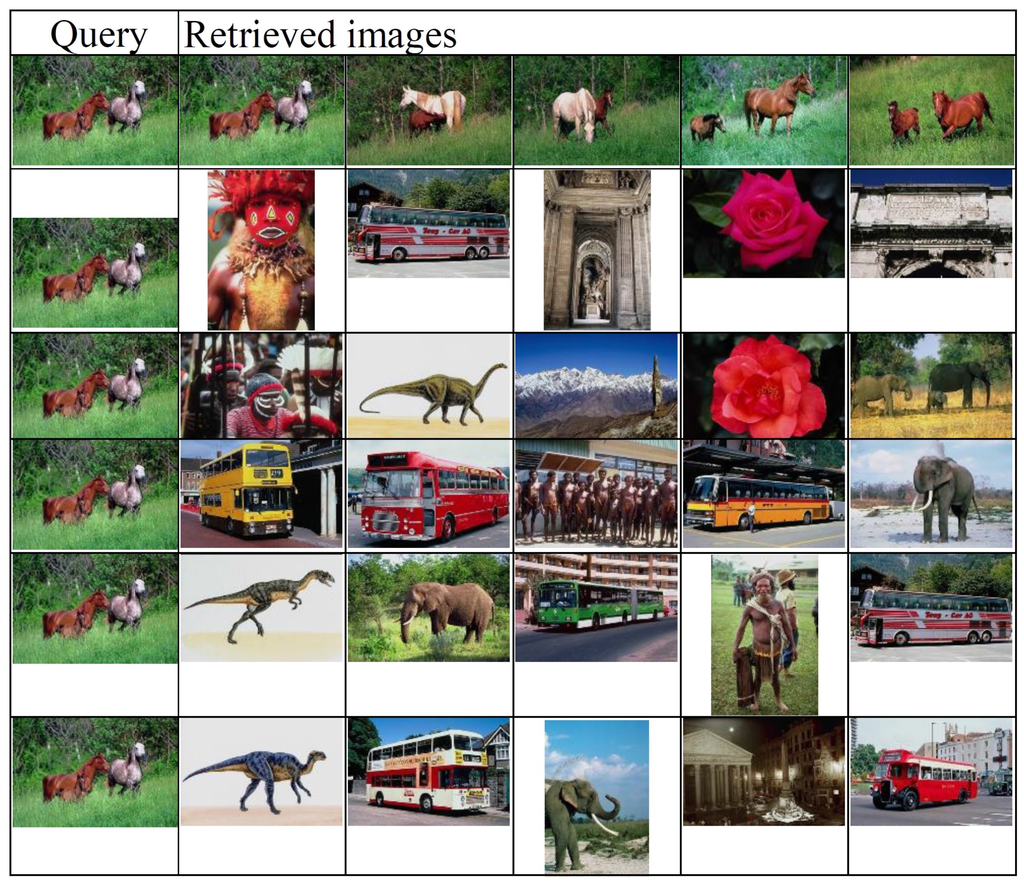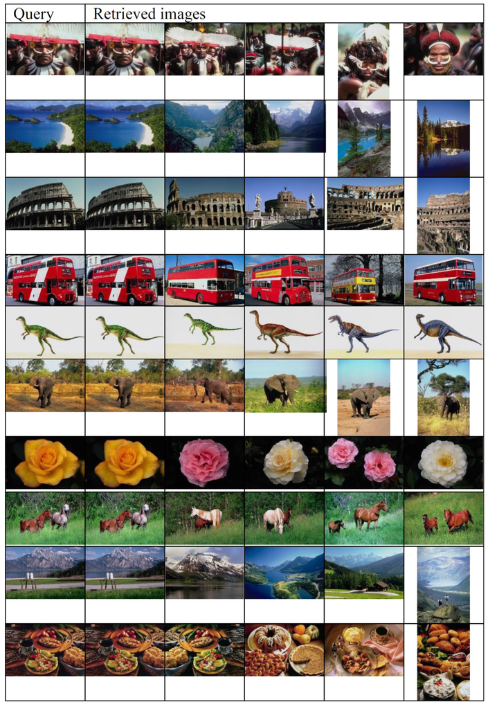 We test the ability of our proposed scheme to retrieve the images most similar to the provided query. Figure 9 shows samples of our results. The first column represents the provided image queries. The other columns show the returned images arranged according to their similarity to the corresponding query. The columns show that our scheme can usually retrieve images in the same category as that of the query image.