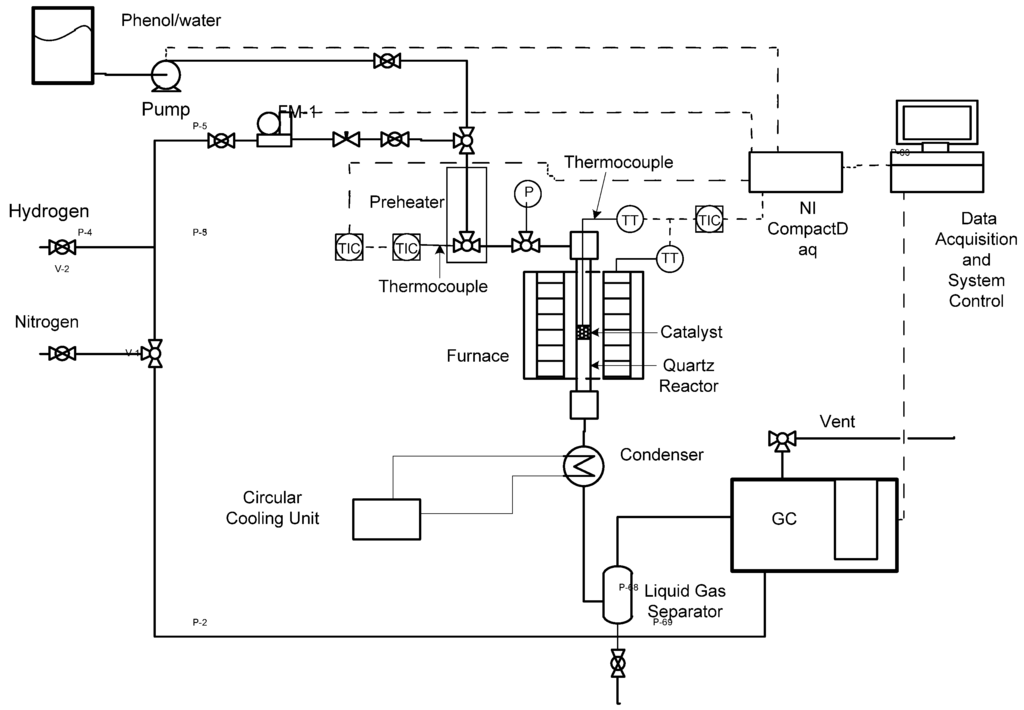 A 0.2 g weight of catalyst was employed to investigate the performance of the catalyst. The catalyst bed was located inside a 6-mm ID quartz tubular reactor. A coaxially centred thermocouple was incorporated into the reactor. The nitrogen stream passed through the catalyst at 300 °C and subsequently reduced in situ with a 30 mL/min stream of pure hydrogen for 1 hour at 600 °C. The mixture of phenol and water was fed into the pre-heater by means of an HPLC pump (Bio-RadTM, Series 1350, Berkeley, CA, USA) before mixing with carrier N2. The samples in reduced forms were tested in the steam reforming of phenol (H2O/phenol(mol/mol) = 9:1) at an atmospheric pressure and a temperature range of 500 to 800 °C, maintaining the reaction for 6 h in order to check if there was any deactivation of the catalysts. The reaction products were analysed on-line by GC with TCD (Agilent 6890N, Agilent Technologies, Santa Clara, CA, USA ) equipped with Carboxen Plot 1010 capillary column (Fused Silica, 30 m × 0.53 mm, Sigma-Aldrich Corporation, St. Louis, MO, USA) connected in series, using argon as the carrier gas. The 95% level of confidence interval was chosen for the uncertainty in figure values for gas production and phenol conversion. The flow diagram of this work was the same as the study done by Abdullah et al. [34] and is shown in Figure 1. As a result of the products variation, the catalyst performance was characterized by two parameters; phenol conversion percentage and product yield. They were calculated according to Equations (3) and (4):