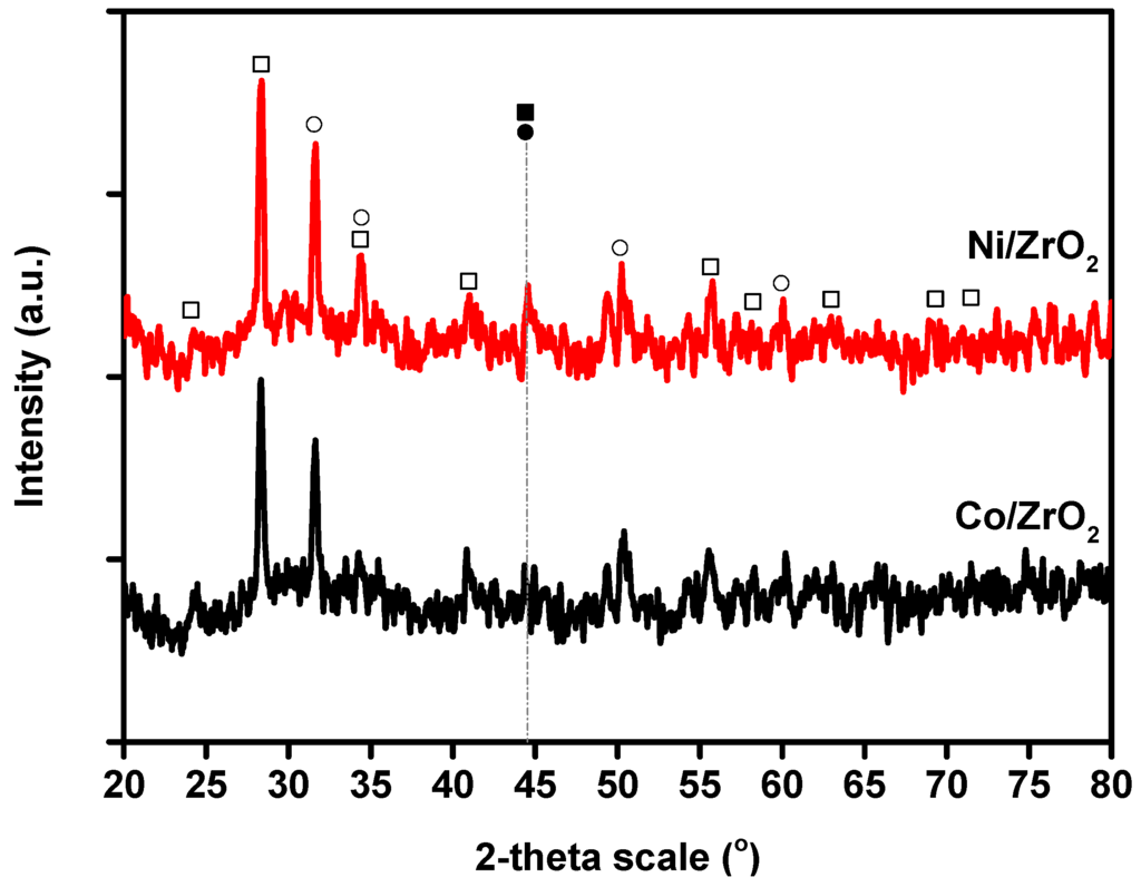 XRD pattern for Ni/ZrO2 and Co/ZrO2 catalysts after reduction at 600 °C; (●) peaks correspond to metallic Ni, (■) peaks correspond to metallic Co, (□) peaks correspond to monoclinic phase of ZrO2 (m-ZrO2) and (○) peaks correspond to tetragonal phase of ZrO2 (t-ZrO2).