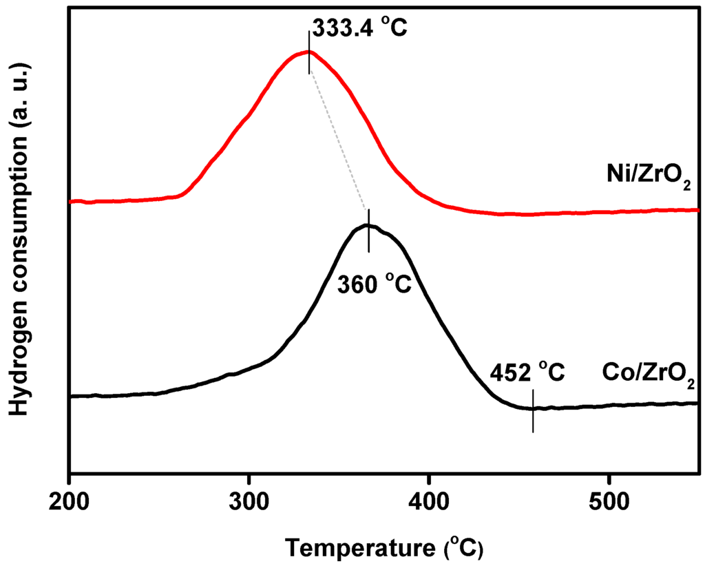 TPR-H2 profiles for the Ni/ZrO2 and Co/ZrO2 catalysts.