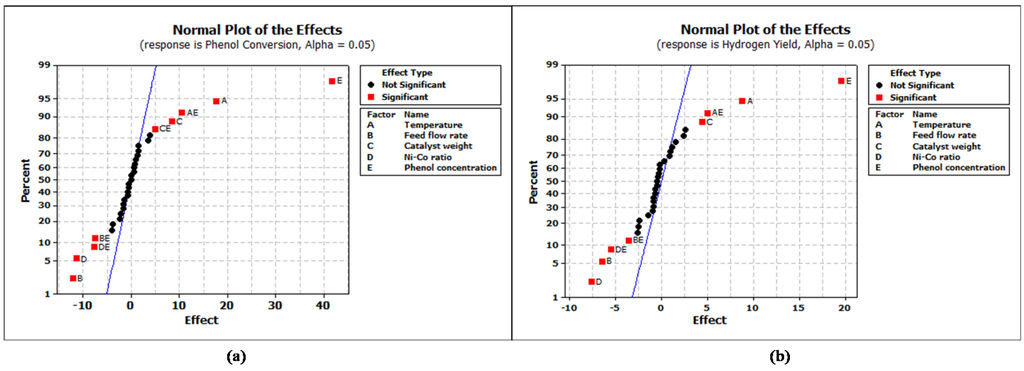 Table 2 gives the experimental values of the two main responses in each experiment. The 2-level factorial was employed to improve the correlation between the five process variables, temperature, feed flow rate, amount of catalyst and the catalyst of Ni to Co ratio, and phenol concentration in the feed (coded as A, B, C, D, and E, respectively) to responses of phenol conversion (Y1) and hydrogen yield (Y2). Thirty-two sets of experiments were performed to explore the effects of the reaction parameters on the phenol conversion and the generation of hydrogen in the phenol steam reforming process. It was found that the conversion of the phenol varied from 2.7% to 96.8% and H2 yield was in the range of 21.4%–72.4%. The maximum catalyst activity for Y1 of 96.8 and Y2 of 72.4% was found to be at 800 °C, 0.16 mL/min feed flow rate, 0.3 g of catalyst, 0 ratio of Ni-Co (Co/ZrO2), and 10 wt % of phenol in the feed (run number 32).