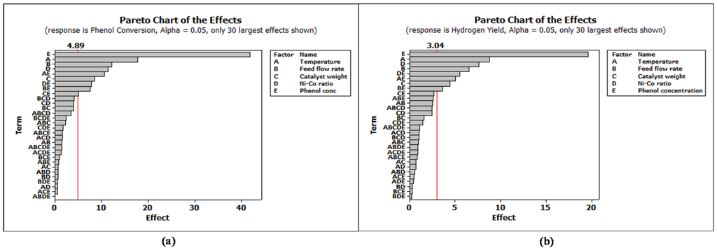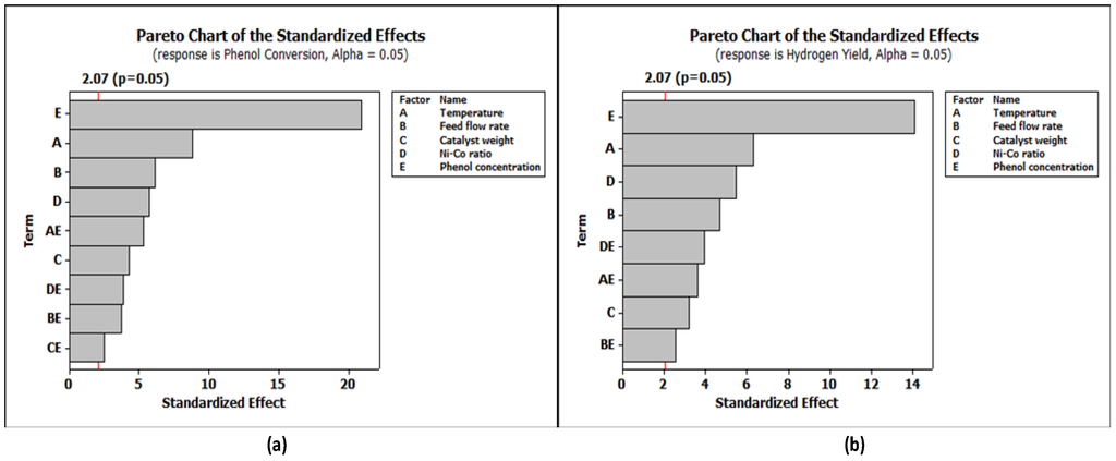 where Yi is the predicted response, β0 is the offset term, βn is the regression coefficient that corresponds to the main effects and interaction effects, and ε is the error term. The level of significance of each coefficient was considered by comparing the smaller p-value (<0.05) or greater t-value. The t-test was used to determine the significance of the regression coefficients of the parameters. The p-values were used as tools to check the significance of each variable and the interaction among the variables. As the first step, a significance test was performed on all the possible terms in models for phenol conversion (Y1) and hydrogen yield (Y2). The results are illustrated in Pareto charts and Normal plots. Then a reduced model was obtained by removing the insignificant terms from the first model with a new reduced regression equation. The R2 value was used to determine the fitting quality of the observed results to the proposed model. The regression analysis, linear regression plots (observed versus predicted value), and Pareto chart of the dependent variables, main effect and interaction plots, surface and contour plots, and response optimizer plots were plotted.