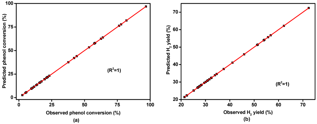The reduced linear regression model for production of hydrogen from phenol was fitted for Y1 and Y2 through the application of multiple regression analysis on the experimental data and subsequent removal of insignificant terms as shown in Equations (8) and (9). From the analysis of the regression coefficient, the value of the model helps in making inferences about whether there is a need for a complex model for better fit. The significances of the models were determined by the experimental F-value derived from the regression coefficient analysis. On the other hand, the tabulated F-values are calculated based on the degree of freedom for regression and residual at a specific confidence level. If the F test for the model is significant at the 5% level (p < 0.05), then the model is fit and can adequately account for the variation observed.