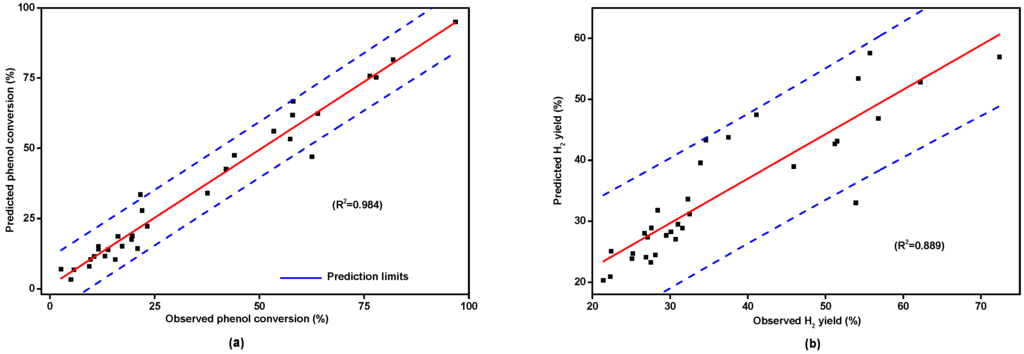 Parity charts of predicted versus observed responses for the reduced models of phenol conversion (Y1) (a) and hydrogen yield (Y2) (b) with a 95% prediction band.