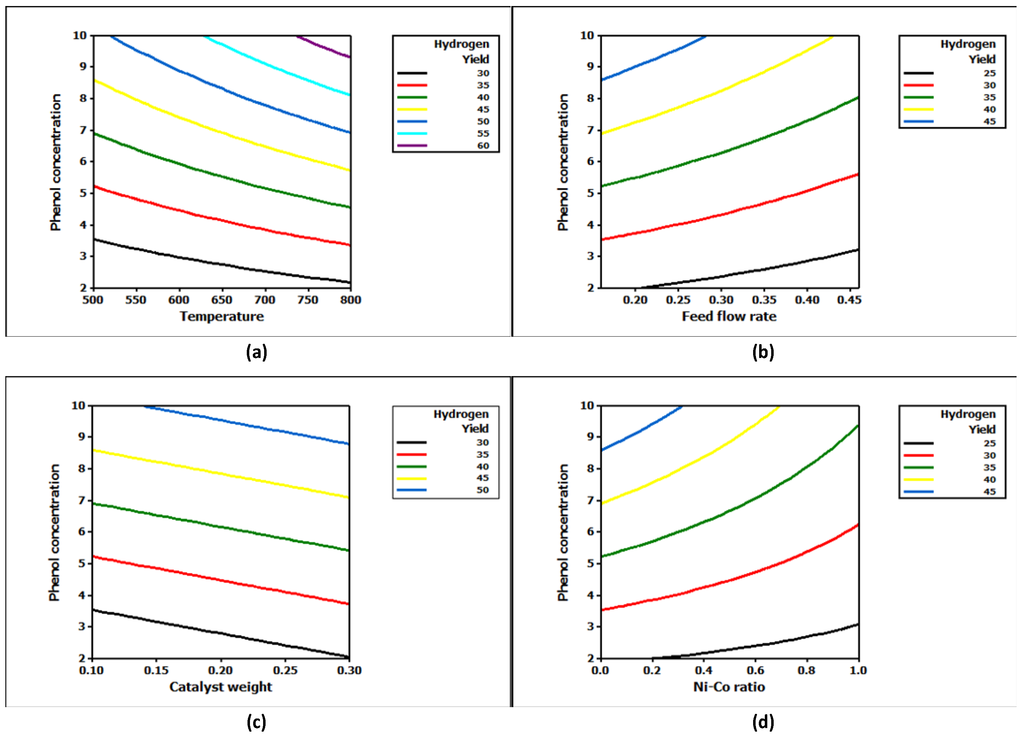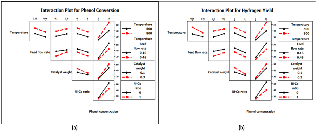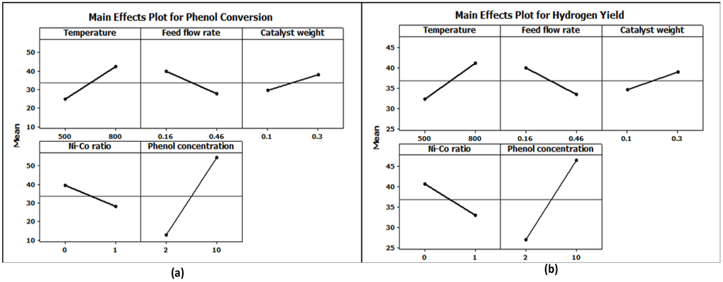 Graphs of the main effects were plotted in order to identify the factor level providing the minimum response value, as shown in Figure 9. Figure 9 presents the mean changes that occurred in both responses (Y1 and Y2) when the levels of the main factors were changed from the lower level, passing through the central point, to a higher level. The reference line represents the overall mean. A main effect is present when the mean response changes across the levels of a factor. This plot shows that the Y1 and Y2 changes depend on the levels of factor E (phenol concentration) with the steepest line. The steeper the slope of the line, the greater the magnitude of the main effect. Therefore, the concentration of phenol should be studied in detail. It can be seen that for the temperature there were great changes in the mean phenol conversion (Y1) and hydrogen yield (Y2), characterized by a great degree of departure from the horizontal (but less than the phenol concentration main effect). Therefore, a higher temperature is desirable to get higher phenol conversion and hydrogen yield. This is because of the favorable hydrocarbon conversion at high temperatures [56]. Feed flow rate and Ni/Co ratio showed slight negative changes in mean Y1 and Y2. Y1 and Y2 decreased from 39.8% and 40.1% to 27.6% and 33.5% with the increase of feed flow rate from 0.16 to 0.46 mL/min, respectively. On the other hand, Y1 and Y2 also decreased from 39.5% and 40.6% to 28.02% and 32.97% with the increase of the Ni to Co ratio from 0 to 1. Nianjun et al. [52] used NixCoy/Al2O3 catalysts to investigate the activity of glycerin liquid reforming. They noticed that an increase in Co content results in maximum H2 and minimum CH4 production. They mentioned that low content of Ni is unfavorable for carbon–carbon breaking. Consequently, the performance of the reforming process was lowered. Hence, it can be concluded that temperature and phenol concentration variables highly influenced Y1 and Y2, whereas feed flow rate, Ni/Co ratio, and catalyst weight had minor effects due to their lines being less sharp against the x-axis. These patterns were previously identified by statistical significance (Pareto charts and analysis of the regression coefficient data).