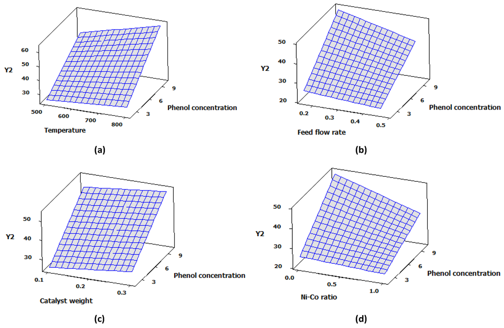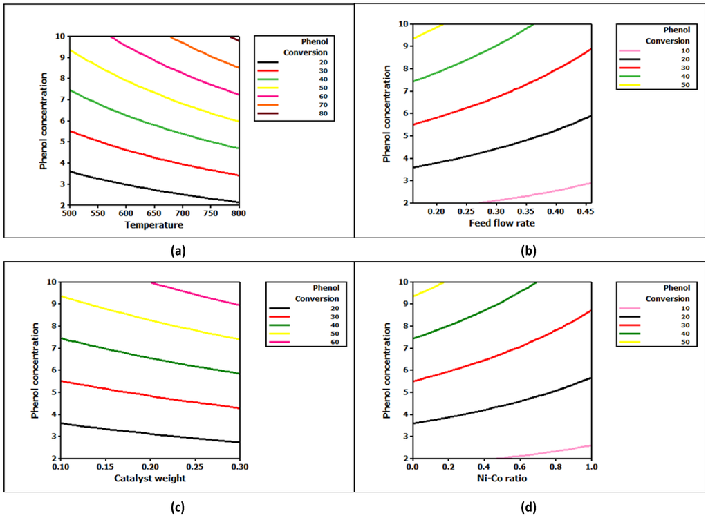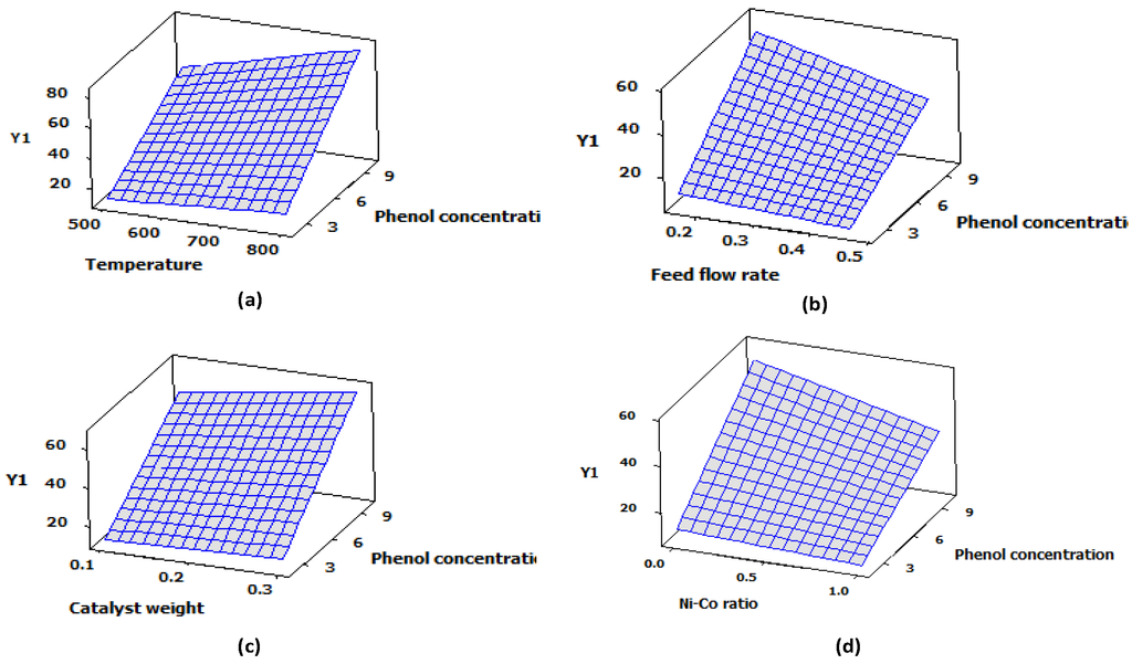 As is seen from the analysis of the regression coefficient results in Table 5, all of the variables (temperature (A), feed flow rate (B), catalyst weight (C), Ni-Co ratio (D), and phenol concentration (E)) and their interactions (AE, BE, CE, and DE) are statistically significant and affect the phenol conversion (Y1) response. The response surface plots are useful in understanding the relationship between the main and interaction effects of the variables [61]. The contour plots are curved lines because the model contains the interactions of the factors (AE, BE, CE, and DE). The surface and contour plots given in Figure 11 and Figure 12 show the relative effects of any two variables when the remaining variables are kept constant. In general, the results of surface and contour plots reveal that the phenol concentration plays an important role in catalyst activity towards phenol conversion. The surface and contour plots for AE in Figure 11a and Figure 12a show the interactive effect of phenol concentration (E) and temperature (A) by keeping B, C, and D constant. The phenol conversion is relatively high for high levels of A and E. In the same way, the surface and contour plot show the interactive effect of B and E through keeping A, C, and D constant. Figure 11b and Figure 12b show the Y1 response of the mutual interactions between the variables. It was found to be high at a low flow rate and high phenol concentration. Furthermore, when the catalyst weight ranged from 0.1 to 0.3 g the effect on the Y1 response was significant (Figure 11c and Figure 12c). On the other hand, Figure 11d and Figure 12d show that the NiCo ratio and phenol concentration (D versus E) have a negative effect on Y1 response. In conclusion, surface and contour plots prove the results of the regression coefficient data and the Pareto charts.