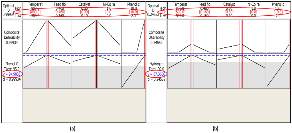 Finally, the Minitab Response Optimizer tool helps to obtain the best possible result for phenol conversion (Y1) and hydrogen yield (Y2). Moreover, it can help solve problems involving several design variables and one or more responses simultaneously. It also has an interactive graphic mode that helps in investigating local behaviors around an optimized solution. By using a response optimizer, the optimal conditions for the suggested reduced model (Equations (8) and (9)) were found to be 800 °C, 0.16 mL/min feed flow rate, 0.3 g catalyst weight, 0 Ni/Co ratio, and 10 wt % of phenol concentration in order to obtain 94.98% of Y1 and 67.4% of Y2 responses (Figure 15a,b, respectively).