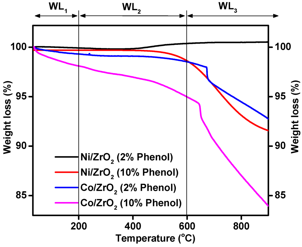 The changes occurring during the steam reforming of Ni/ZrO2 and Co/ZrO2 catalysts were studied through thermo-gravimetric analyses (TGA) of the used catalysts for different phenol concentrations. As is shown in Figure 16, they had different amounts corresponding to the weight loss associated with decomposition/oxidation of graphite from the catalyst. The carbon deposit types depend carbon oxidation temperature. The curves of weight loss as a function of temperature can be divided into three parts: below 200 °C (WL1), 200–600 °C (WL2), and above 600 °C (WL3). In the literature, the region below 200 °C has been attributed to water and moisture evaporation. The weight loss between 200 °C and 600 °C has been ascribed to less stable deposits [62], whereas the weight loss above 600 °C is generally attributed to oxidation of coke deposits with a more stable [62] and/or different degree of graphitization [63]. In general, Ni/ZrO2 has less coke deposited on its surface than Co/ZrO2. The TGA result shows that the Ni/ZrO2 catalyst for 2% phenol concentration in the feed did not suffer from any coke formation on its surface in all WL1, WL2, and WL3 regions. This catalyst profile exhibited additional weight gained; this might be due to the oxidation of the metallic active sites [64,65]. A significant mass loss was found for both Ni/ZrO2 and Co/ZrO2 catalysts when the phenol concentration increased from 2% to 10% and the temperature rose above 600 °C due to the increase in carbon molecules in the feed. Therefore, a higher phenol concentration leads to higher catalyst activity in terms of phenol conversion and hydrogen production but causes the carbon deposition to increase.