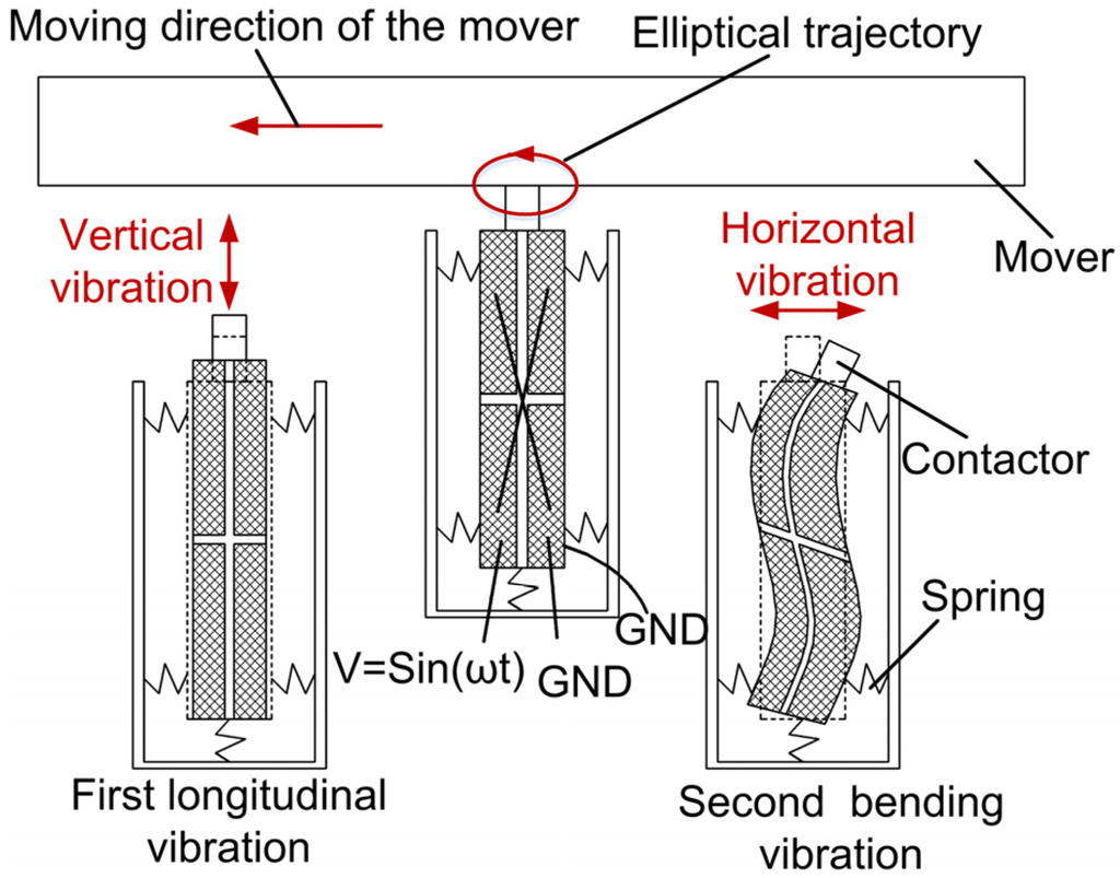 - Wan, Z.J.; Hu, H. Modeling and experimental analysis of the linear ultrasonic motor with in-plane bending and longitudinal mode. Ultrasonics 2014, 54, 921–928. [Google Scholar] [CrossRef] [PubMed]