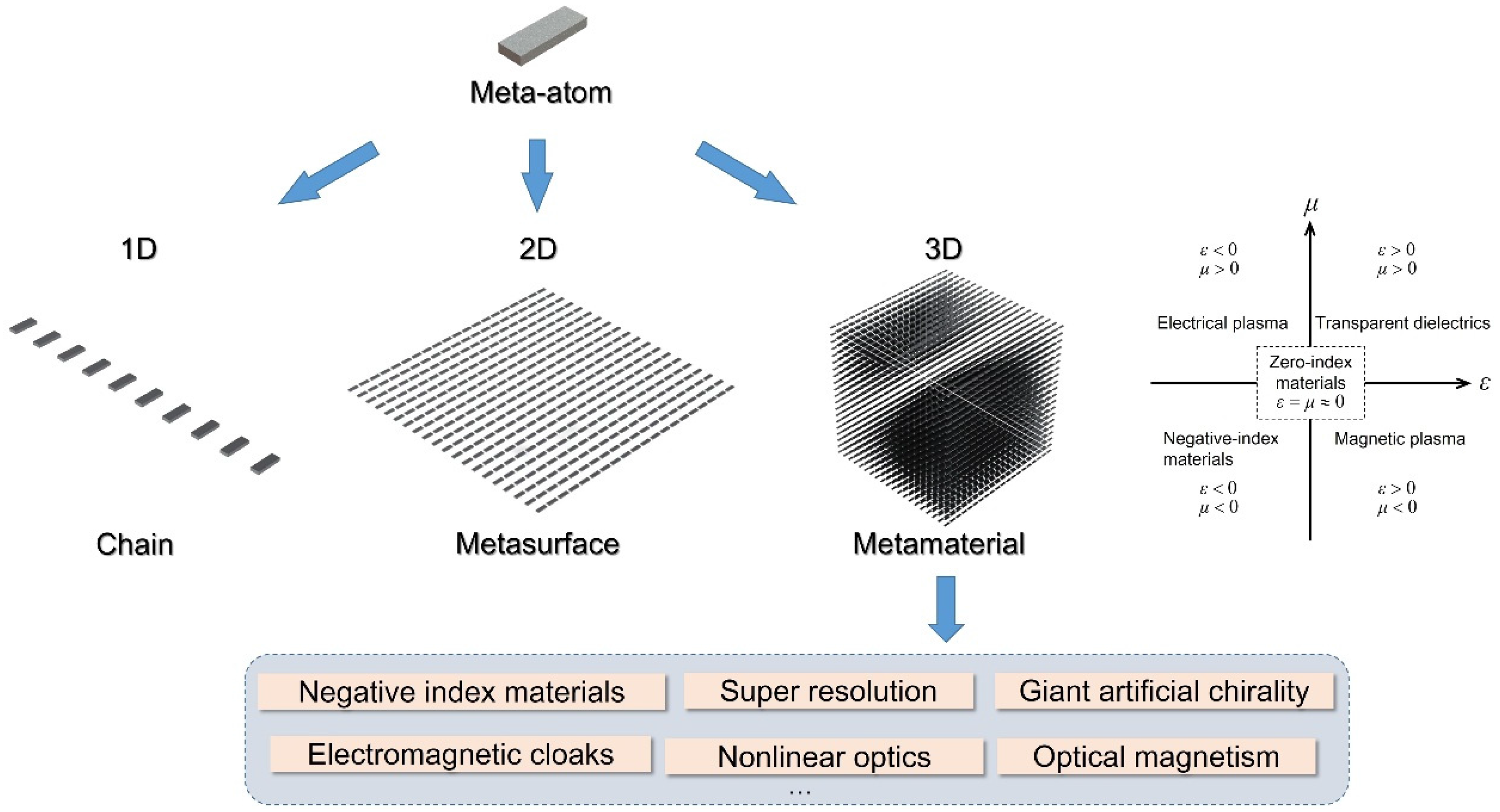 Schematic illustration of meta-atom, 1D chain, 2D metasurface and 3D metamaterials. Inserts are the representation of the parameter space for permittivity ε and permeability μ and the typical examples of the applications of metamaterials.
