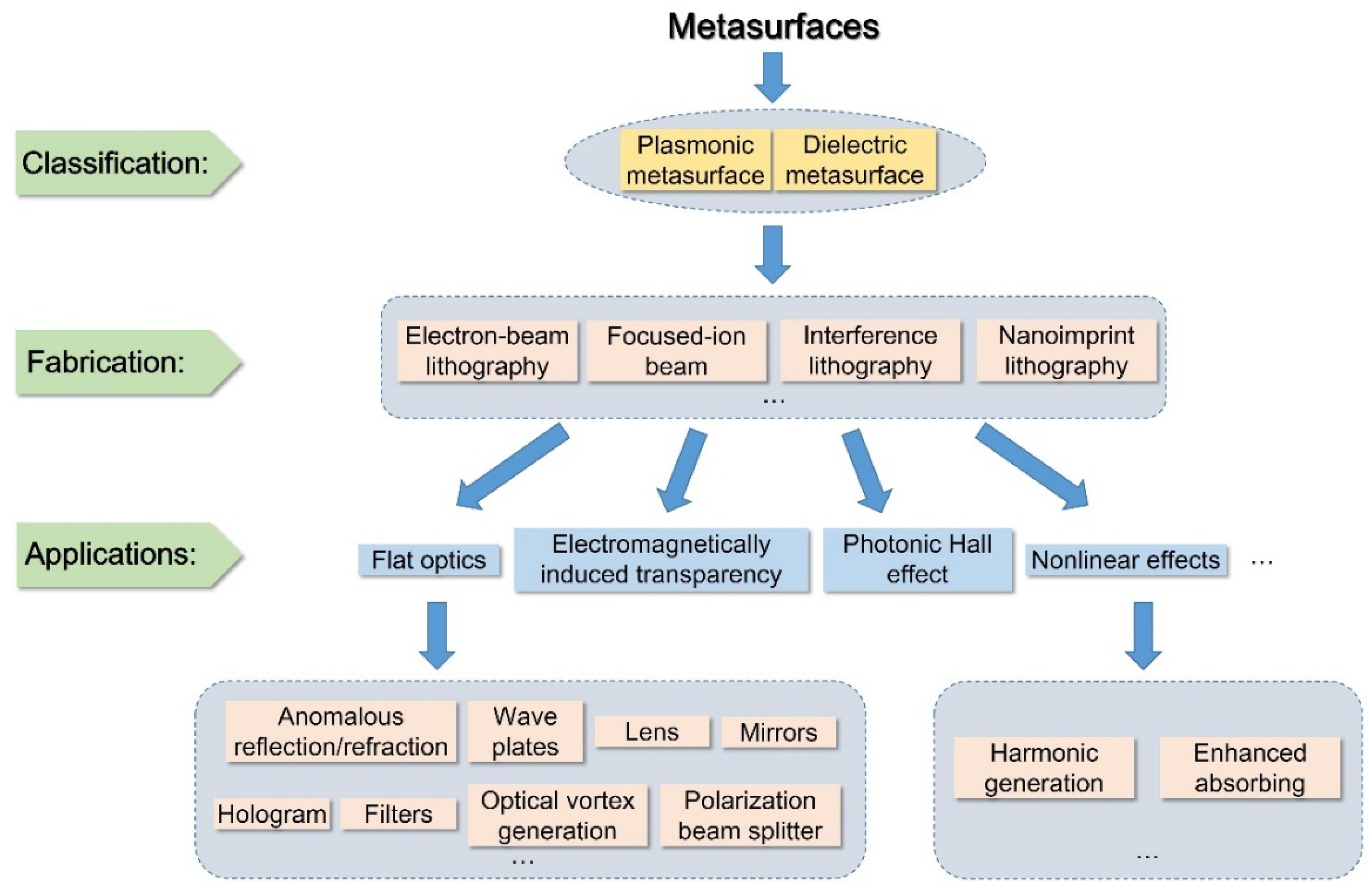 Schematic illustration of the classification, fabrication and applications of metasurfaces.
