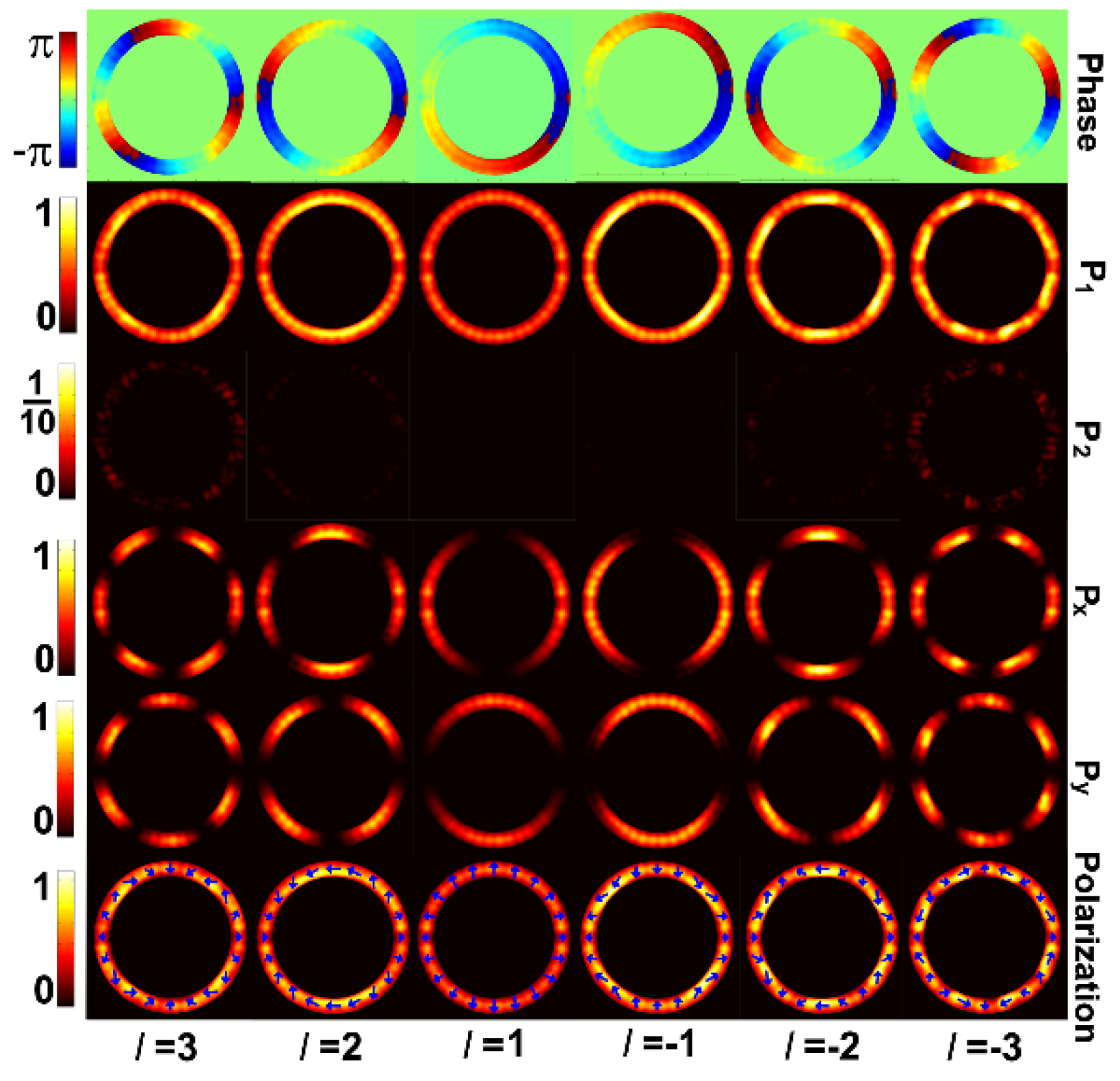Figure 4 depicts the spatial distributions of phase, power and polarization of output beams under the excitation of input left circularly-polarized light (Ein = [1 i] T). We set the wavelength at 1550 nm to characterize the properties of the generated OAM-carrying vector beams. The employed metasurfaces have an orientation angle of α () = l + α0, where l varies from +3 to −3 and α0 = 0. We use E1 and E2 to represent the electric field components along the directions of e1 () and e2 () in Figure 3b, respectively. The first row of Figure 4 shows the spatial phase distribution of E1, indicating that output beams carry OAM with a charge number of l from +3 to −3. The second and third rows of Figure 4 show spatial power distributions (P1 ∝ |E1|2, P2 ∝ |E2|2) along the directions of e1 () and e2 (), respectively. It is found that the power component P1 is much larger than P2. The extinction ratio (ER), defined by 10 × log10(P1/P2), exceeds 20 dB. Hence, the electric field component E2 along the direction of e2 () can be ignored. The fourth and fifth rows of Figure 4 show spatial power distributions (Px, Py) along x and y axes, respectively. The alternative bright and dark power distribution implies that the polarization state rotates with the azimuthal angle . The sixth row of Figure 4 shows the calculated spatial polarization distribution, implying the generation of vector beams with a polarization order of l from +3 to −3. The obtained results shown in Figure 4 confirm the successful generation of OAM-carrying vector beams using metal-assisted metasurfaces.