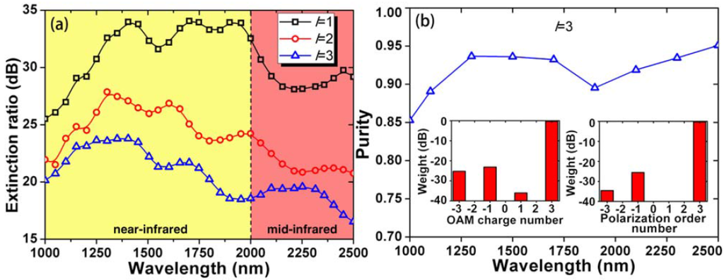 We also study the operation bandwidth. Metasurfaces with an orientation angle of α () = l + α0 (l = 1, 2, 3) are considered. Left circularly-polarized light is adopted as the input excitation source. We use ER and purity to characterize the quality of the generated OAM-carrying vector beams. Figure 5a plots ER as a function of wavelength. One can clearly see the high-quality broadband generation of OAM-carrying vector beams ranging from 1000–2500 nm, i.e., from near-infrared to mid-infrared. For l = 1 and 2, the ER is kept above 20 dB over a 1500-nm bandwidth (1000–2500 nm). For l = 3, ER > 16 dB over a bandwidth of 1500 nm (1000–2500 nm) and ER > 20 dB over a bandwidth of 800 nm (1000–1800 nm) are achieved. Shown in Figure 5b is the wavelength-dependent purity for the OAM-carrying vector beam (l = 3), which is larger than 0.85 over a bandwidth of 1500 nm (1000–2500 nm). The insets depict weight spectra as functions of OAM charge number and polarization order number at 1550 nm. High values of purity are achieved.