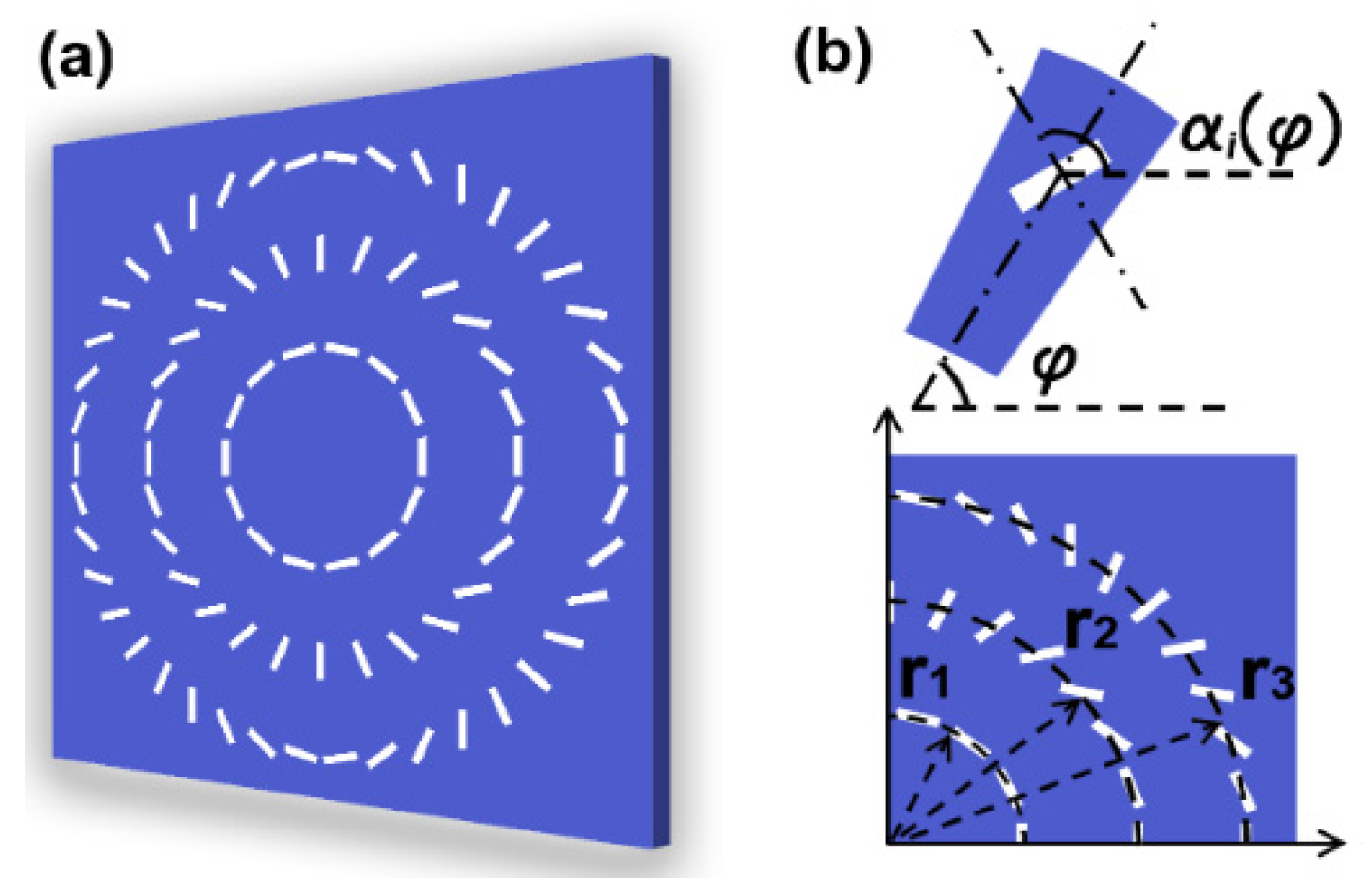 (a) Schematic structure of metasurfaces; (b) geometric parameters: the radius of the ring is ri = (2i + 0.3) × 700 nm, where i = 1, 2 and 3. The rectangular aperture has dimensions of 600 × 140 nm and an orientation angle of αi () = i + αi0 with respect to the x axis. Reproduced with permission from [119], Copyright The Optical Society, 2013.