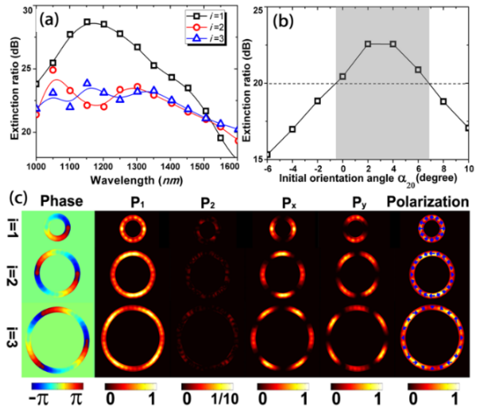 Figure 7a shows ER as a function of wavelength. One can see broadband operation from 1000–1550 nm with an extinction ratio above 20 dB, which indicates high-quality broadband (~500 nm) generation of OAM-carrying vector beams. We further study the fabrication tolerance by evaluating the performance dependence on the initial orientation angle αi0 of the rectangular aperture. Figure 7b shows the extinction ratio as a function of the initial orientation angle α20 of rectangular apertures in the second ring. The extinction ratio is kept above 20 dB when α20 is varied from −1 to 7 degrees. The obtained range of initial orientation angle around eight degrees implies the good fabrication tolerance of the designed metasurfaces. We use E1i and E2i to denote the electric field components on the directions of e1i () and e2i () (similar to e1 () and e2 () in Figure 3b), respectively. We calculate the phase of E1i and the power components on directions of e1i (), e2i (), x and y axes, which are represented by P1, P2, Px and Py, respectively. The spatially-variant polarization state of the OAM-carrying vector beams is also calculated. These results are shown in Figure 7c. Clearly, the power components on the direction of e1i () are much larger than those on the direction of e2i (). The phase distributions in Figure 7c indicate that the electric field component E1i carries OAM with a charge number of m = i (i = 1, 2, 3). The spatial distribution of Px, Py and the polarization state confirm that the OAM-carrying vector beams have a polarization order of l = i (i = 1, 2, 3).