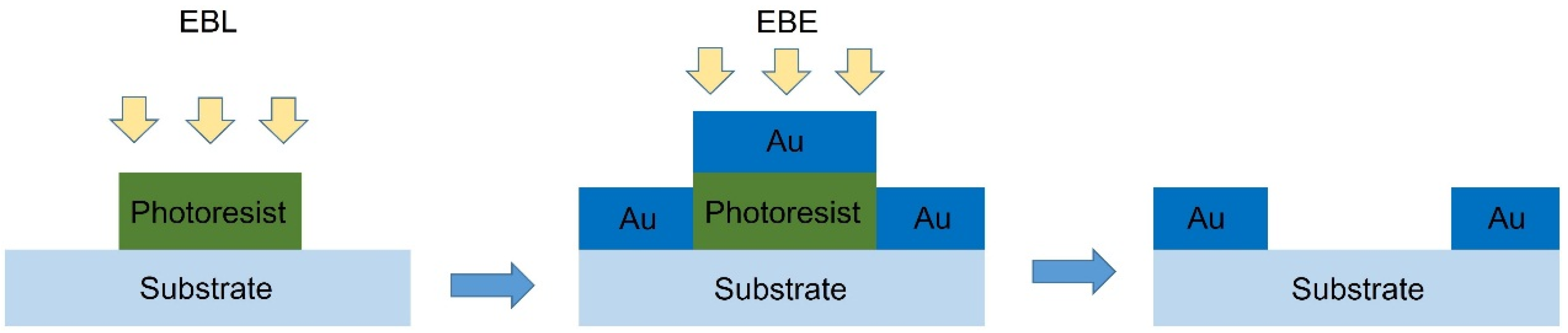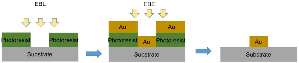 Fabrication: The proposed metasurfaces to generate broadband OAM carrying vector beams can be fabricated using the existing fabrication techniques. Figure 8 shows the schematic diagram of the fabrication process of the proposed metasurfaces: (1) using standard electron-beam lithography to generate patterns on the glass substrate; (2) 5 nm Cr and 200 nm Au layers are then respectively deposited on the substrate using electron-beam evaporation; (3) removing the photoresist and undesired metal layers.