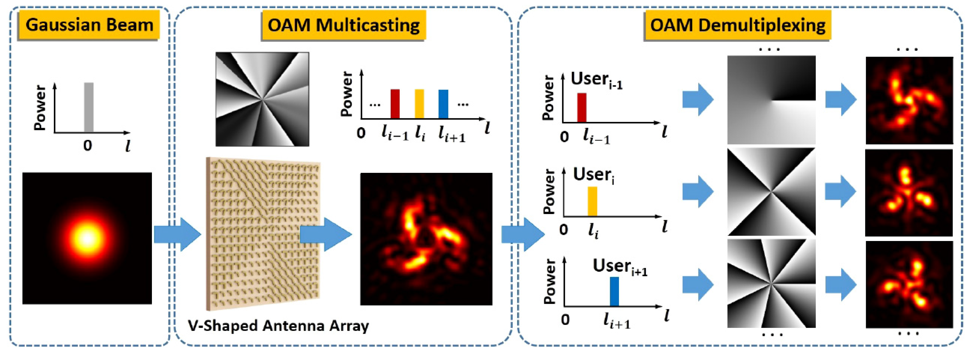 Design: We design a V-shaped antenna array to realize on-chip multicasting from a single Gaussian beam to four OAM beams. Figure 9 illustrates the concept and principle of N-fold multicasting of OAM beams using V-shaped antennas. At the OAM multicasting side, an input Gaussian beam (l = 0) with a planar phase front at its beam waist is modulated by a V-shaped antenna array, which is specially designed to be equivalent to a complex multi-OAM phase pattern to generate collinearly-superimposed multiple OAM beams. After the modulation, the signal data carried by the input Gaussian beam are duplicated and delivered to N OAM beams, which are distinguishable from each other owing to their different charge values. The phase singularity of OAM beams contributes to the zero intensity distribution at the center of superimposed multiple OAM beams. At the OAM demultiplexing side, those N OAM beams (..., li−1, li, li+1, ...) are distributed to N end users (..., Useri−1, Useri, Useri+1, ...), respectively. For each end user, an inverse spiral phase pattern is used to remove the spiral phase front of the desired OAM beam, leading to a bright spot at the center, which can be separated from other OAM beams by spatial filtering.