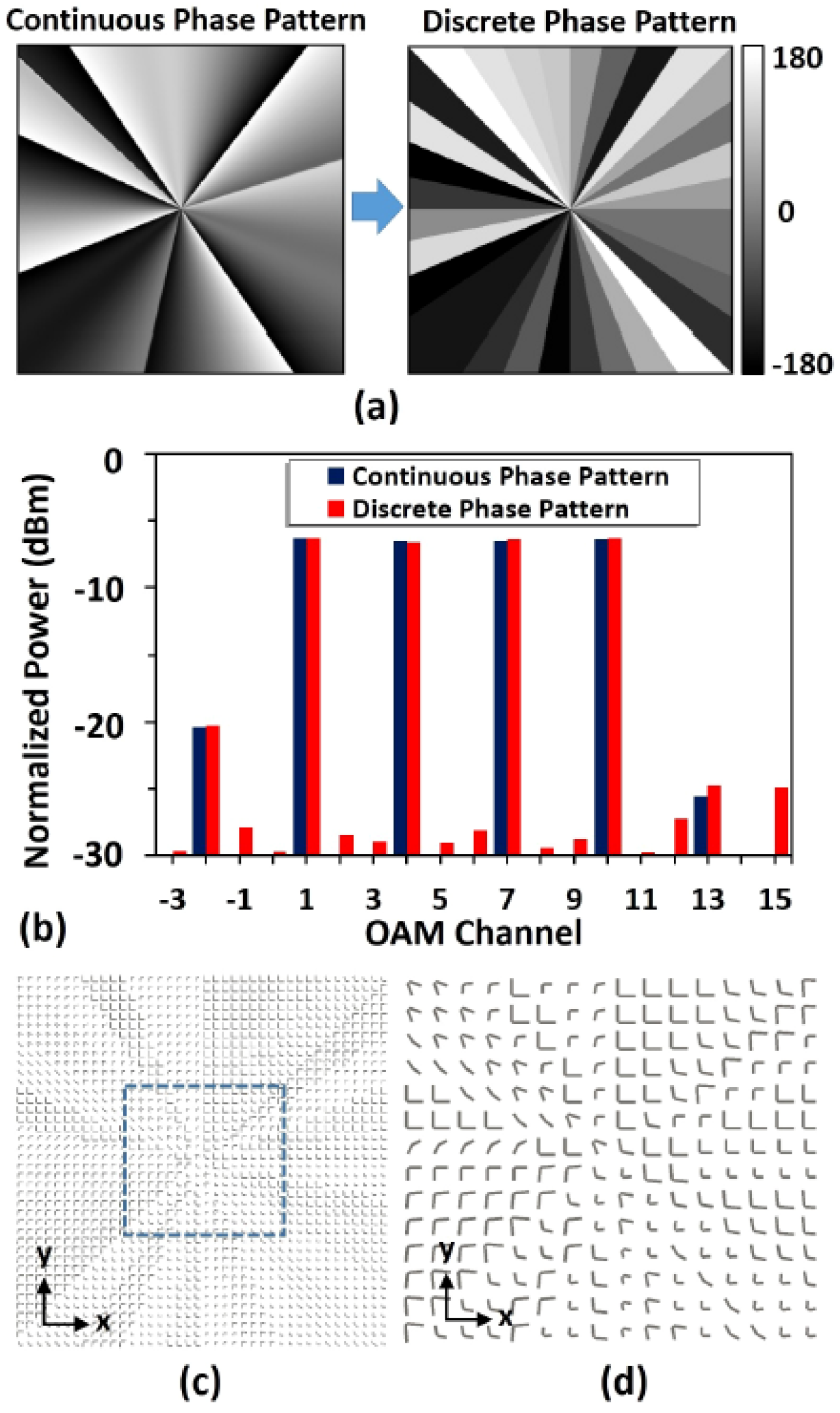 (a) Discretization of the ideal continuous phase pattern; (b) power distributions of OAM channels generated by the continuous phase pattern and the discrete phase pattern; (c) top view of the designed V-shaped antenna array based on the discrete phase pattern; it repeats with a periodicity of 2 μm in both the x and y directions; (d) details of the designed V-shaped antenna array. Reproduced with permission from [120], Copyright Nature Publishing Group, 2015.