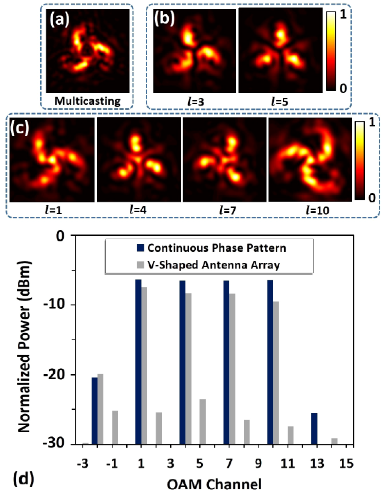 (a) Intensity distribution of the four collinearly-superimposed OAM beams; (b) intensity distribution of the undesired OAM channels after demultiplexing; (c) intensity distribution of the multicasting OAM channels after demultiplexing; (d) power distributions of the OAM channels generated by the designed V-shaped antenna array and the theoretical continuous phase pattern. Reproduced with permission from [120], Copyright Nature Publishing Group, 2015.