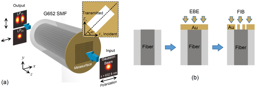 (a) Concept and principle of the LP11 mode generation using the metasurface on the facet of G.652 single mode fiber (SMF); (b) fabrication process of the metasurface on the facet of G.652 SMF. EBE, electron beam evaporation; FIB, focused ion beam. Reproduced with permission from [121], Copyright Nature Publishing Group, 2016.