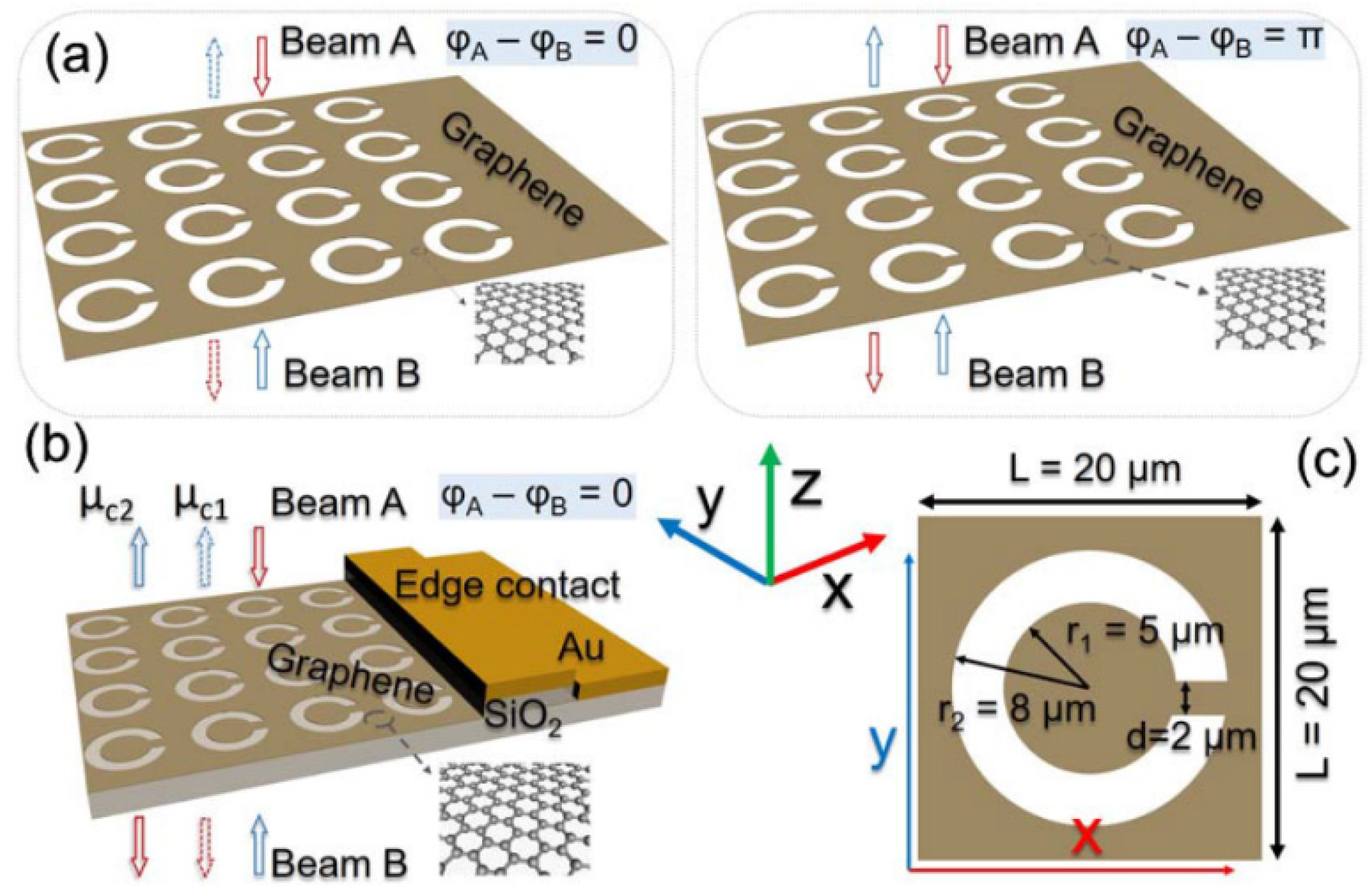Design: We present a novel graphene split-ring metasurface displaying a strong plasmonic resonance in the terahertz regime. Figure 14 shows the 2D and 3D structures of the proposed split-ring graphene film for coherent perfect absorption (CPA). For split-ring graphene film with symmetric two side (air, air) conditions (Case 1), as illustrated in Figure 14a, the interference of two counter-propagating incident beams A and B (relative intensity IA/IB = 1) on such a film is described by two special cases. When the phase difference A − B = 0, the CPA occurs. Thus, the graphene reaches the maximum absorption. When the phase difference A − B = π, Beam A and Beam B pass through one another without mutual disturbance. For split-ring graphene film with asymmetric two side (air, SiO2) conditions (Case 2), gate-tunable CPA is illustrated in Figure 14b, which is based on the electro-absorption effect of graphene. By electrically tuning the Fermi level of the graphene sheet, corresponding to chemical potential μc1, the absorption of split-ring graphene reaches the maximum limit ∼50% for single incident beam. In this situation, when two coherent beams with equal intensities and phases are incident on the graphene from opposite sides, they will interfere with each other, leading to coherent absorption. When the chemical potential of graphene is changed to μc2, the absorption of split-ring graphene is tuned to be weak. Thus, Beams A and B pass through each other nearly without loss. Hence, gate-tunable CPA is achievable.