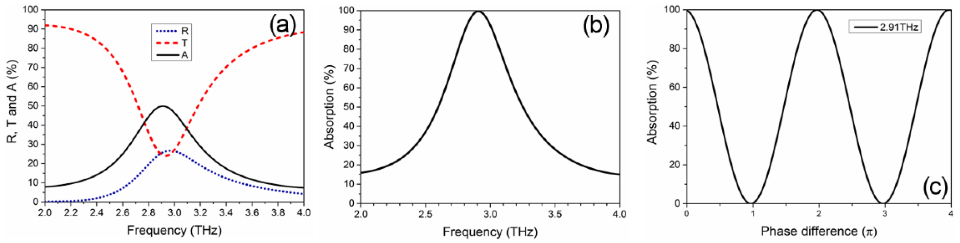 We first study the CPA of split-ring graphene film with symmetric two side (air, air) conditions (Figure 14a). The CPA is enabled by 50% absorption of the single beam and equal intensities and phases of two counter-propagating coherent beams. The chemical potential (Fermi energy) μc = 0.3 eV and relaxation time τ = 0.5 ps are initially considered. The transmission (T), reflection (R) and absorption (A) of a split-ring graphene patterned with a periodical array are plotted in Figure 15a. When a single beam is illuminated on the patterned split-ring graphene film at normal incidence, one can see an obvious resonance around 2.91 THz. The strong resonance behaviors are expected to be electric dipolar mode. The excitation of electric dipolar mode results in the enhancement of absorption in the graphene sheet with a maximum of A = 49.92%. While the other parts of the incident beam energy are reflected or transmitted. As shown in Figure 15b, when two coherent beams with equal intensities and phases are incident on the graphene from opposite sides, they will interfere with each other, leading to coherent absorption of 99.69%. Figure 15c shows the normalized coherent absorption in the split-ring graphene as a function of the relative phase difference between two counter-propagating coherent beams. At the resonance frequency of 2.91 THz, the coherent absorption varies continuously from 99.7% to less than 2.1 × 10−4% as the phase difference changes from 0 to 0.969π, giving a modulation contrast of 56.7 dB.