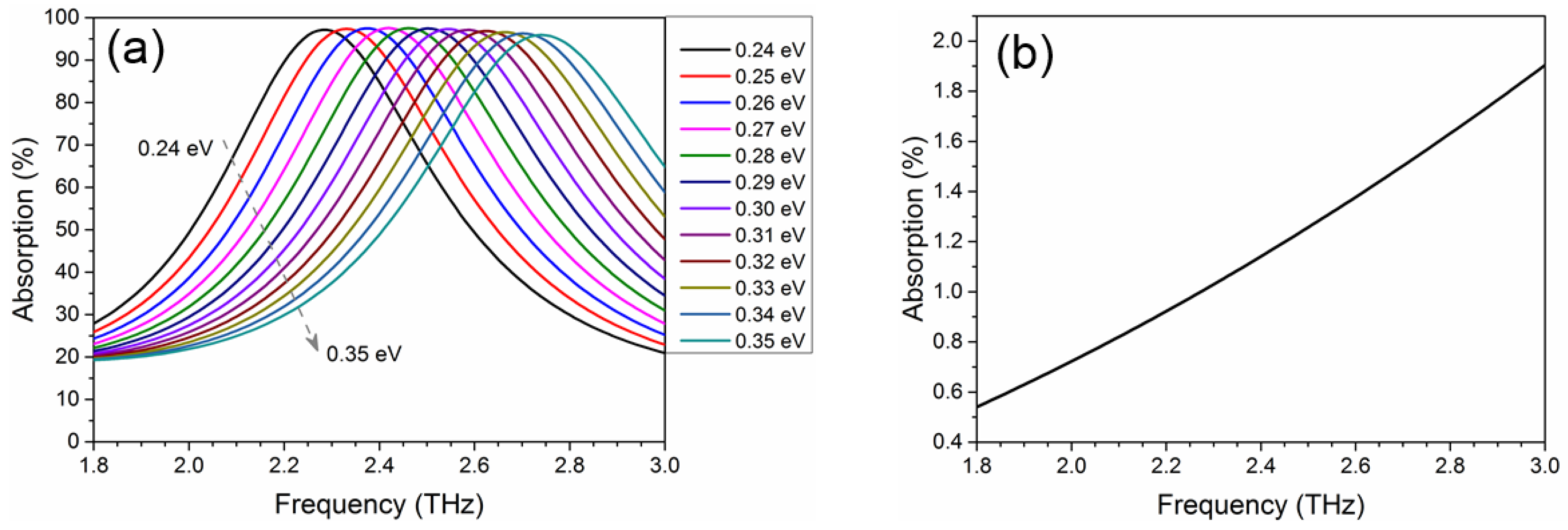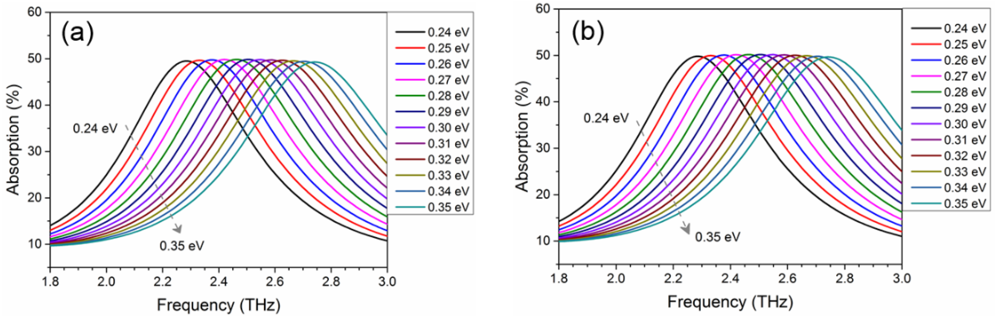 Figure 17 displays the calculated total absorption spectra of the split-ring graphene under different chemical potentials. An absorption peak of 97.13% at 2.29 THz is seen from Figure 17a for μc = 0.24 eV. With the increase of the graphene chemical potential, it shows a blue shift of the resonance peak frequency. When the chemical potential of graphene is tuned to μc = 0.35 eV, the absorption at 2.71 THz can still reach 95.6%. As the Fermi level of graphene can be electrically tuned, one can flexibly control the total absorption of the split-ring graphene. The split-ring graphene possesses the minimum absorption when the chemical potential is μc = 0 eV, as shown in Figure 5b. For the center frequency at 2.5 THz, the maximum and minimum absorption are 97.5% (μc = 2.9 eV) and 1.25% (μc = 0 eV), giving a gate-tunable modulation contrast of 19 dB.