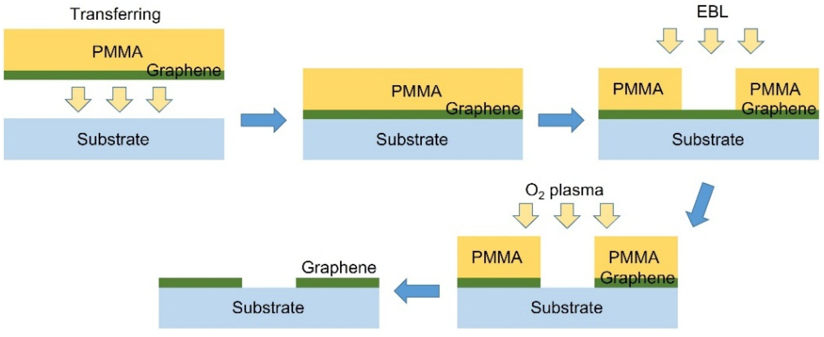 Fabrication: The proposed graphene split-ring metasurface can be fabricated using the existing fabrication techniques. Figure 18 shows the schematic diagram of the fabrication process of the graphene split-ring metasurface: (1) transferring the graphene with the polymethyl methacrylate (PMMA) layer onto the surface of the glass substrate; (2) using standard electron-beam lithography to form patterns on the PMMA layer; (3) using the O2 plasma etching technique to remove the undesired parts of graphene; (4) removing the PMMA layers.