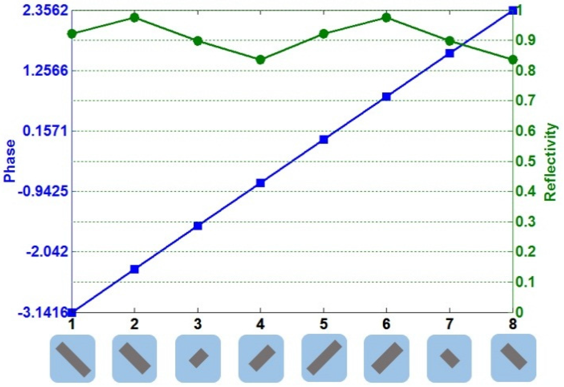Schematic of eight dielectric rectangle resonators chosen to generate OAM beams, providing a phase shift from 0 to 2π and nearly constant amplitude.
