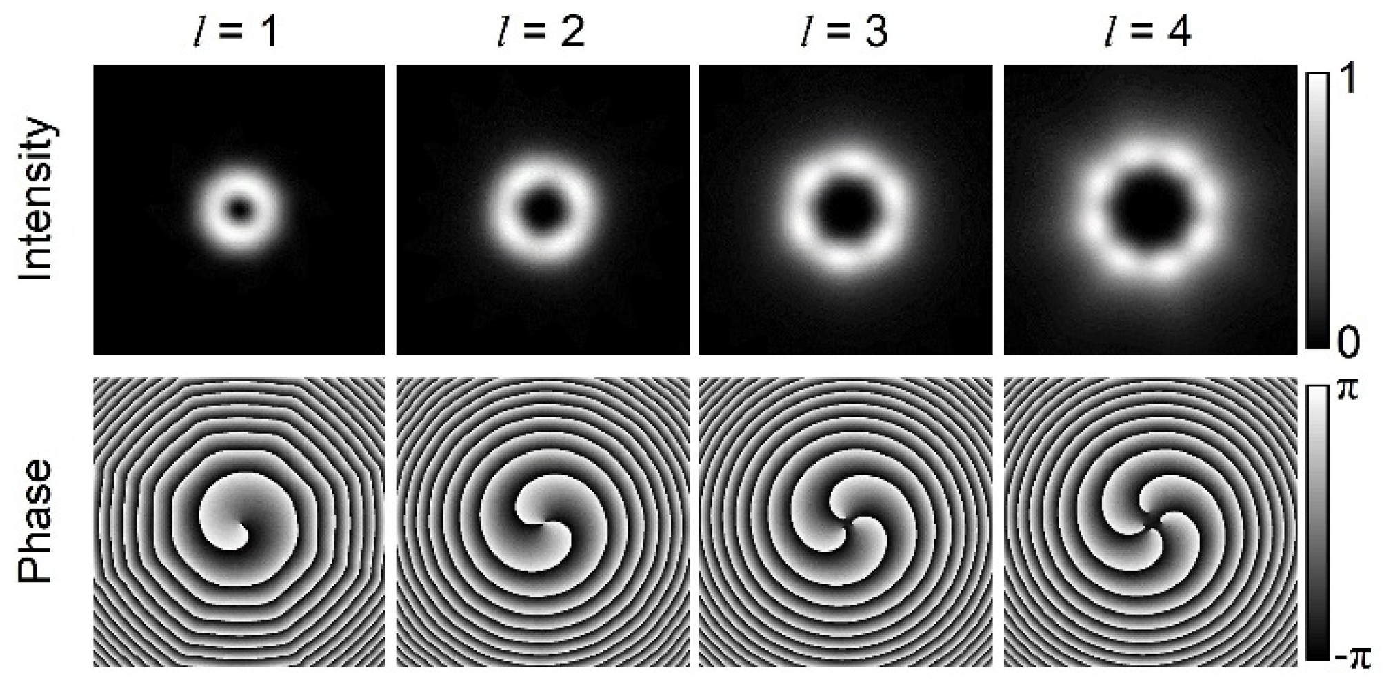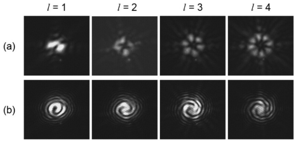 (a) Experimental intensities of the generated OAM beams of l = 1–4 by the proposed dielectric metasurface array at a wavelength of 980 nm; (b) experimental intensities of the generated OAM beams after being interfered with by the Gaussian beam with l = 0.