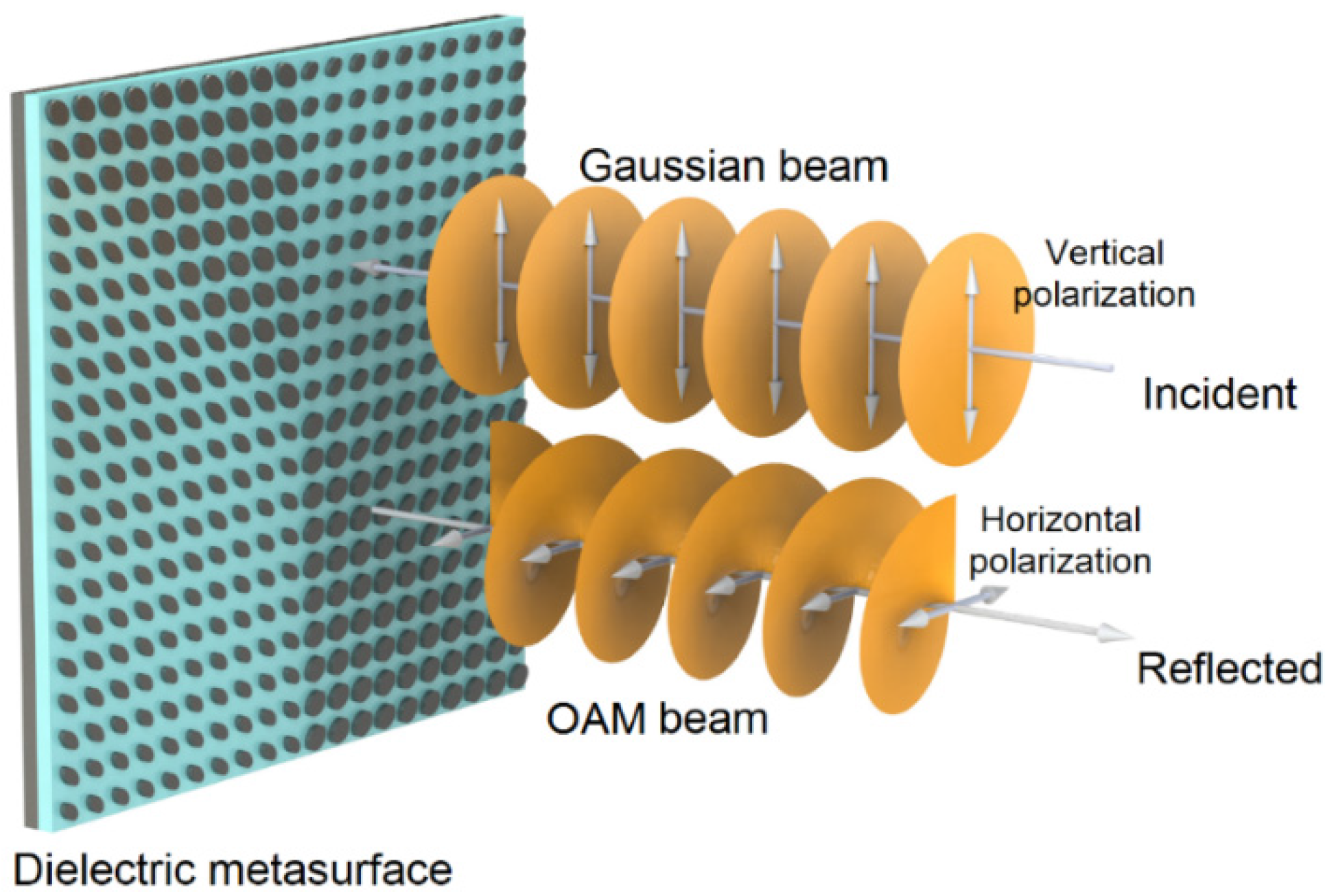 OAM beam generation using the dielectric metasurface at 632.8 nm: Moreover, we also design the dielectric ellipse metasurface arrays at a wavelength of 632.8 nm. Figure 22 shows the concept of OAM beam generation through a dielectric ellipse metasurface array consisting of a series of resonators covering a full-phase modulation. When a Gaussian beam of vertical polarization is incident to the metasurface, the reflected beam can be transformed into OAM beams of horizontal polarization. In view of the polarization conversation happening on the proposed metasurface, one can easily separate the incident and reflected lights. Figure 23 plots the simulated intensity and phase distributions of OAM beams of topological charge number l = 1–4 generated using the dielectric ellipse metasurface array consisting of the eight chosen resonators at a wavelength of 632.8 nm. The results indicate that the generated OAM beams match the theoretical ones well.