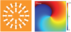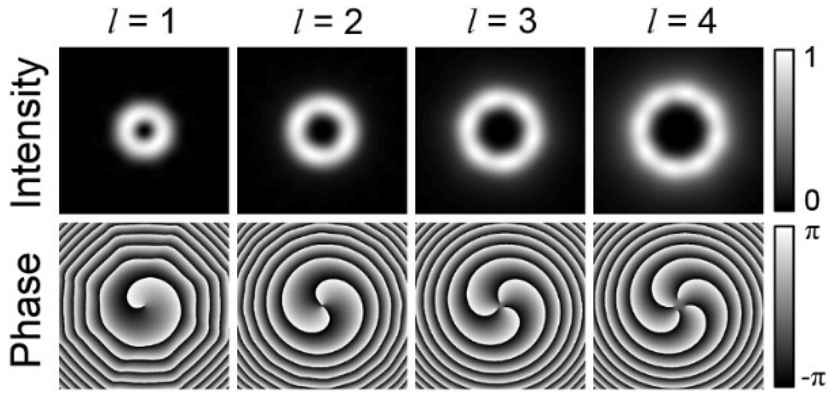 Simulated intensity and phase distributions of the generated OAM beams by the proposed dielectric ellipse metasurface array at a wavelength of 632.8 nm. Reproduced with permission from [123], Copyright The Optical Society, 2016.