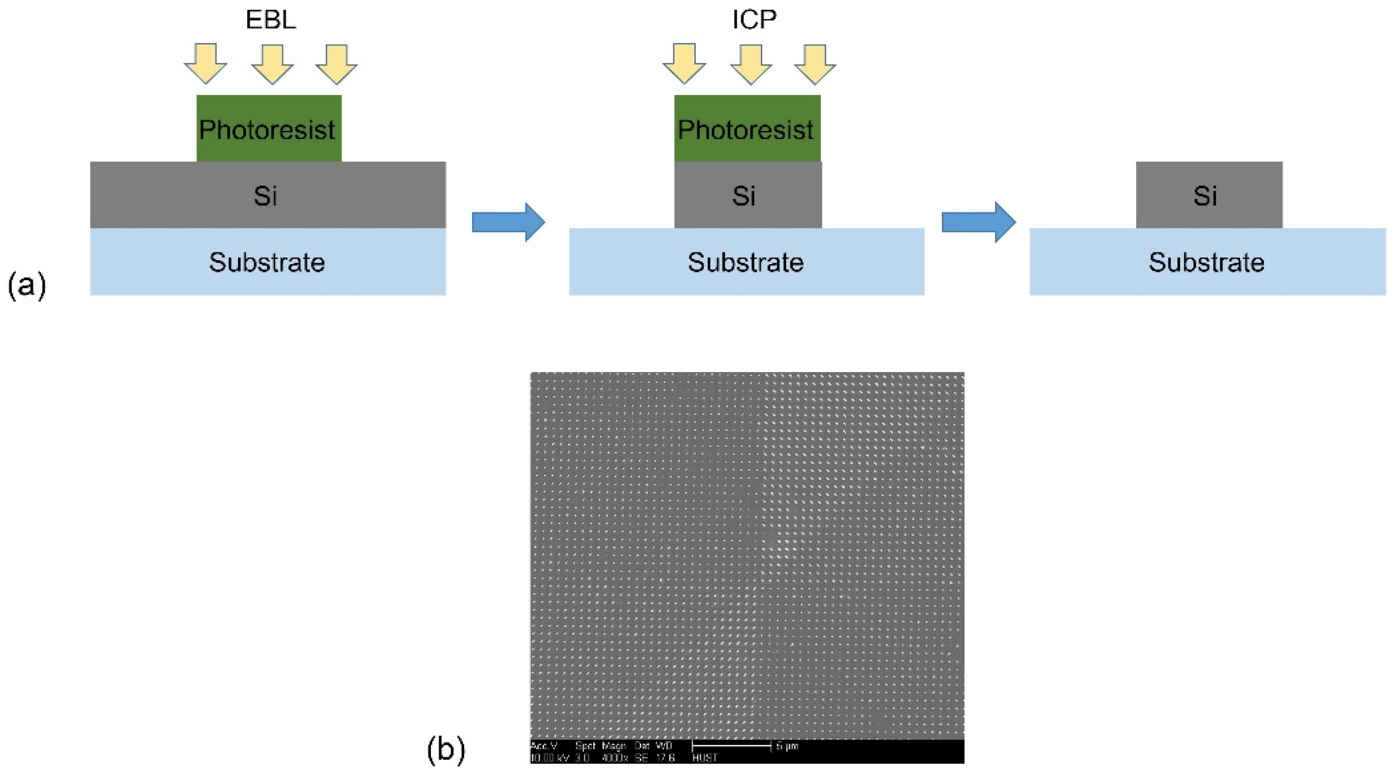 (a) Schematic diagram of the fabrication process of the proposed dielectric ellipse metasurface array (EBL, electron-beam lithography; ICP, inductively-coupled plasma); (b) scanning electron microscope (SEM) images of the top view of a fabricated dielectric ellipse metasurface array to generate the OAM beam. Reproduced with permission from [124], Copyright The Optical Society, 2015.