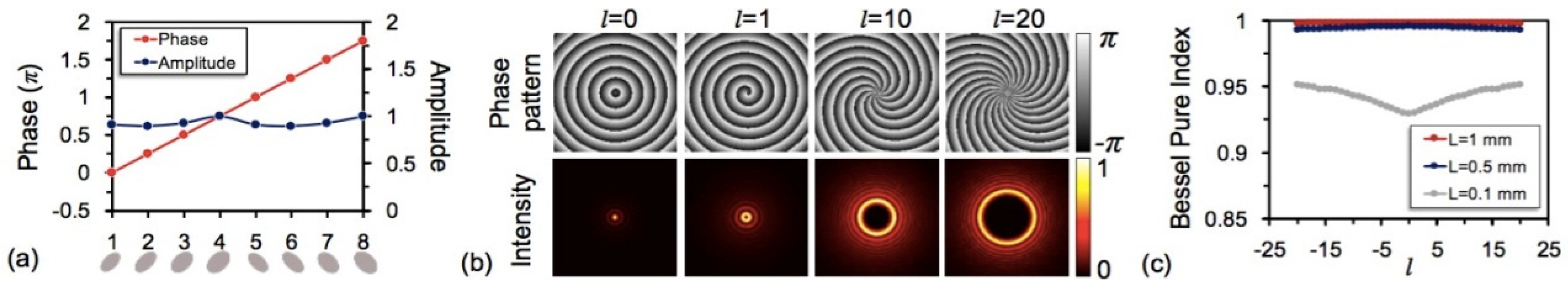 Design: We propose and design dielectric ellipse metasurfaces to realize Bessel beam generation and OAM multicasting at a wavelength of 1550 nm. After the unit structure is simulated by the FDTD method, we choose eight kinds of resonators with different geometric dimensions, as shown in Figure 26a, providing a phase shift from 0 to 2π and a nearly constant amplitude. The method of the phase pattern replacing the axicon is used to generate the Bessel beams. By replacing the phase patterns with the eight chosen resonators, simulated Bessel beams are achieved as plotted in Figure 26b. The purities of the generated Bessel beams with different indices are also analyzed. As shown in Figure 26c, the purities of the generated Bessel beams with different indices of l = −20, −19, ..., 19, 20 are all higher than 0.93.